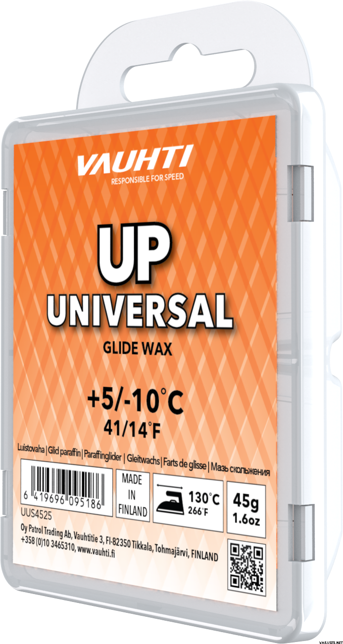 Vauhti Up Universal Orange 45g +5…-10 Glide Wax е създаден за скиори, които изискват висока производителност по време на тренировки. Този плъзгащ восък е идеален както за активни, така и за състезателни скиори, предлагайки плавно и ефикасно плъзгане по снега. Формулата му включва първокласни въглеводородни съставки, цинков стеарат и силициев восък, осигуряващи не само отлична производителност, но и впечатляваща издръжливост.