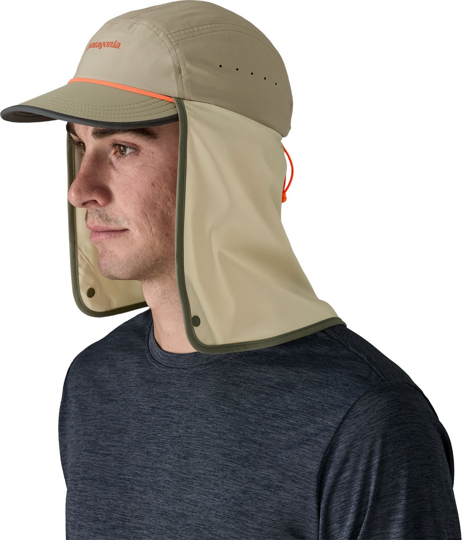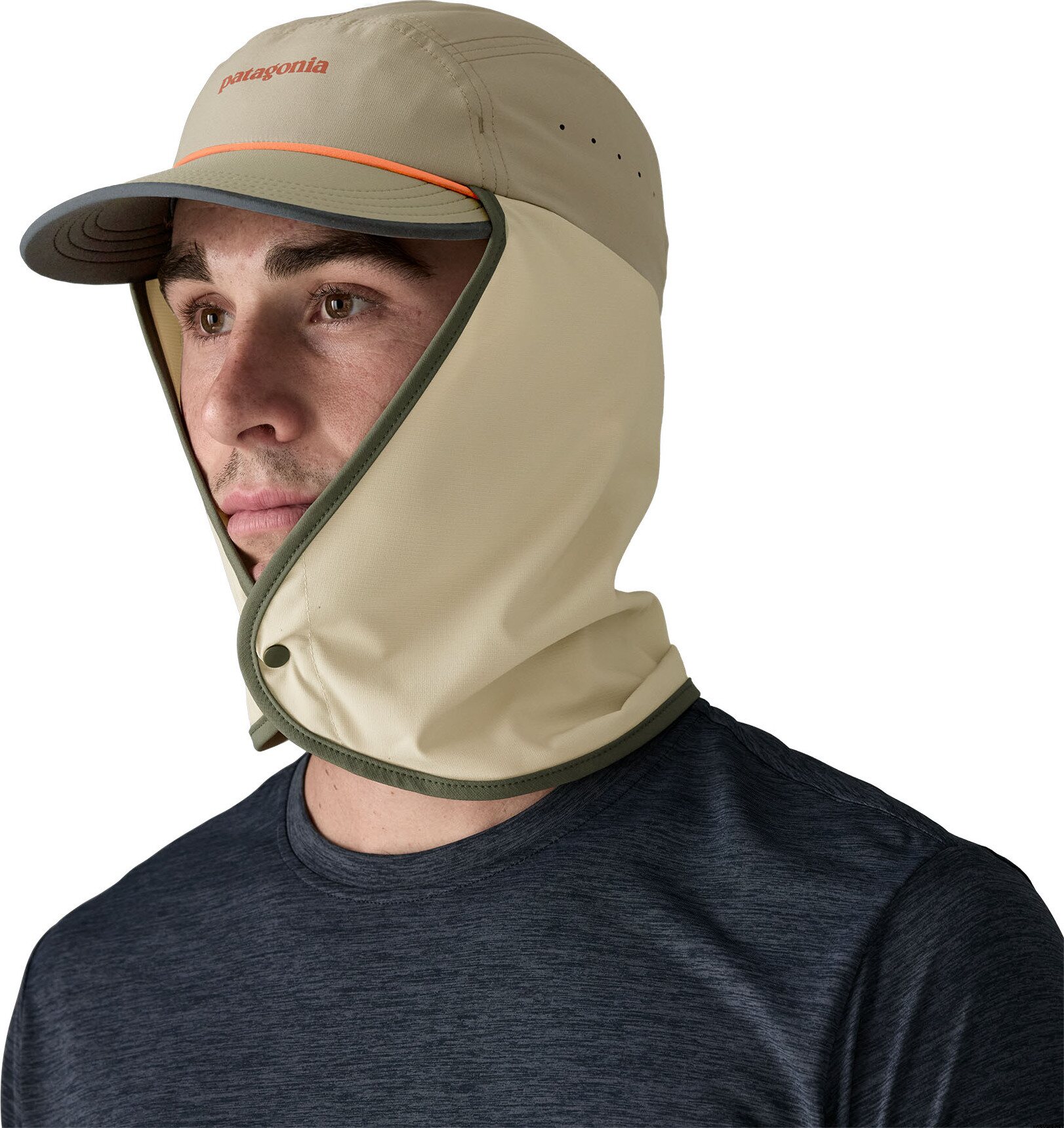 Шапката Patagonia Caped Merganzer се отличава с регулируемо трипосочно слънцезащитно покритие, което е подходящо за дълги дни във водата. Тези шапки са проектирани да съхнат бързо и да отвеждат потта от кожата, като по този начин осигуряват комфорт при топли условия. Плаващата козира добавя спокойствие, ако шапката попадне във водата, а материята пропуска лека влага с DWR покритие без флуоровъглерод. Произведена е във фабрика, сертифицирана по Fair Trade.