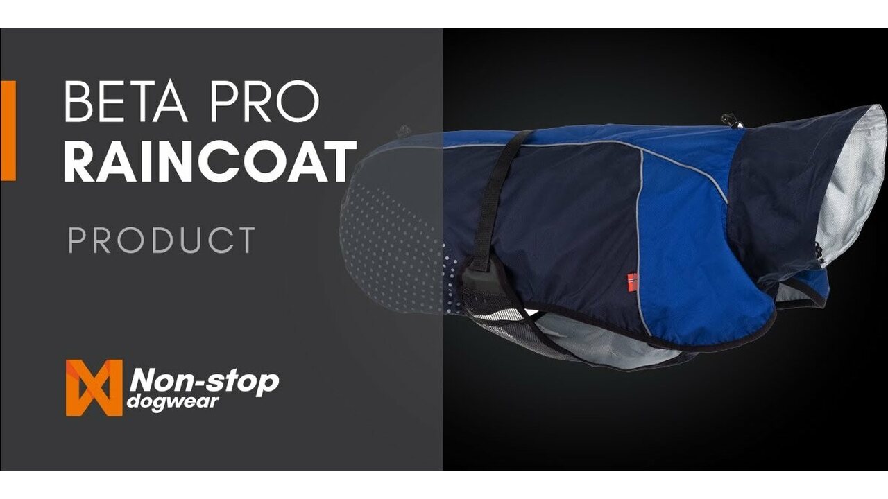 The Beta pro raincoat comes in several color options; black & blue, black & orange, black & purple. Sizes range from 24-90 centimeter measured on the back length. If your dog is between sizes, we recommend you to choose the bigger size. Reflective details provide high visibility in the dark and heavy weather. The raincoat is light-weight and packs easily into the included bag.