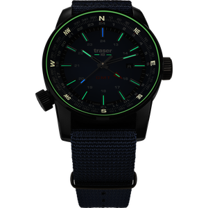 The Traser P68 Pathfinder GMT Blue is the ultimate watch for globetrotters who call multiple places home. This innovative GMT watch features an integrated compass ring, allowing users to track time in two locations while navigating with ease. Thanks to the self-powered trigalight illumination technology, the watch remains visible both day and night, ensuring you never lose your way.