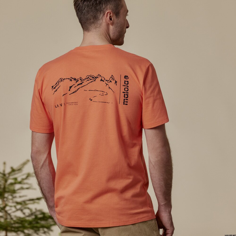 The Maloja WindbachM. Traceable BioRe Tee Mens is a men's t-shirt crafted from 100% organic cotton, offering a comfortable and eco-friendly choice for everyday wear. This t-shirt features a regular fit and showcases a monochrome mountain graphic on the back, part of the LA VIA collection. It is produced under fair and organic conditions, with traceability available online according to bioRe standards.