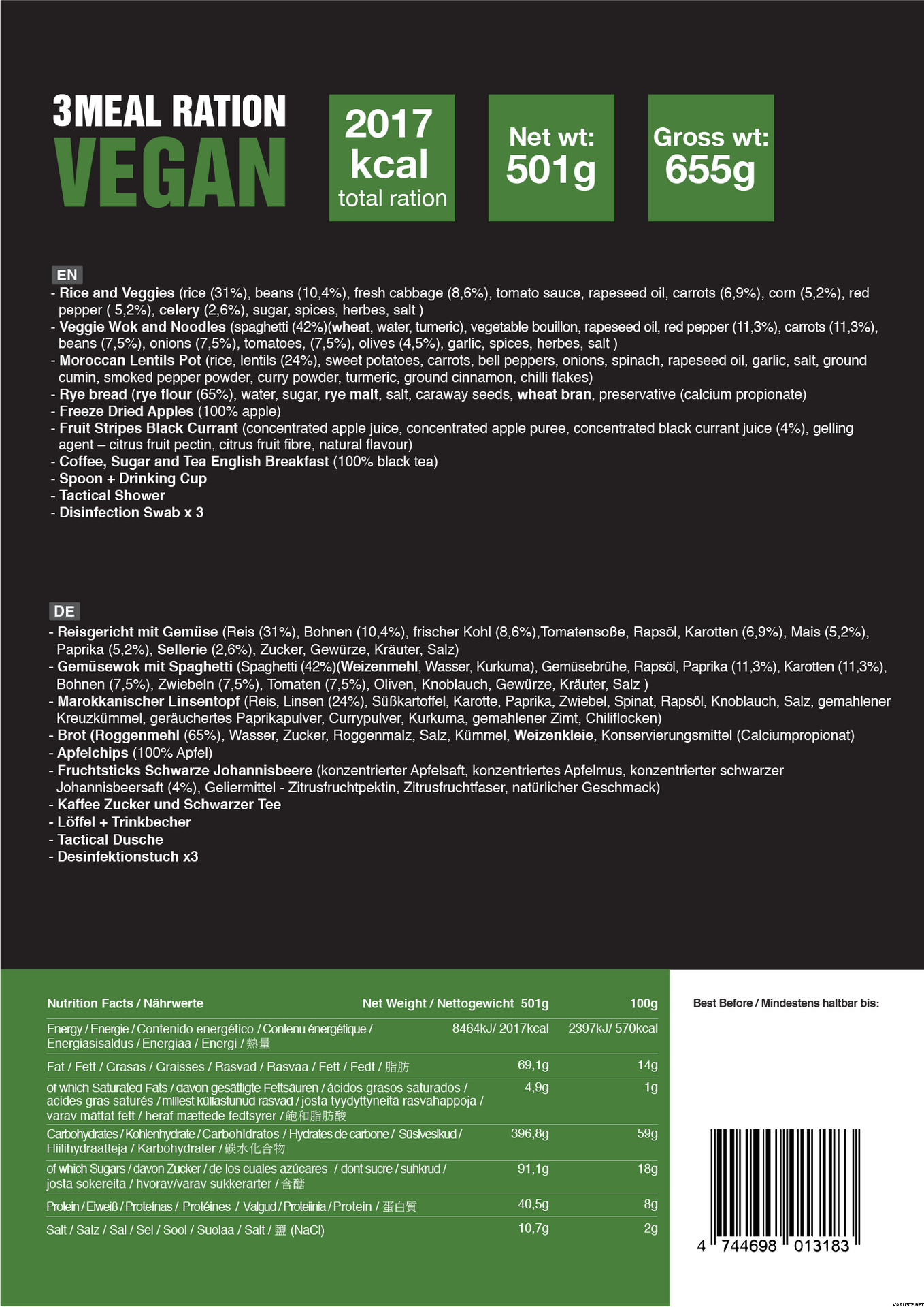 Energy content of 3 Meal Ration Vegan: 2017 kcal