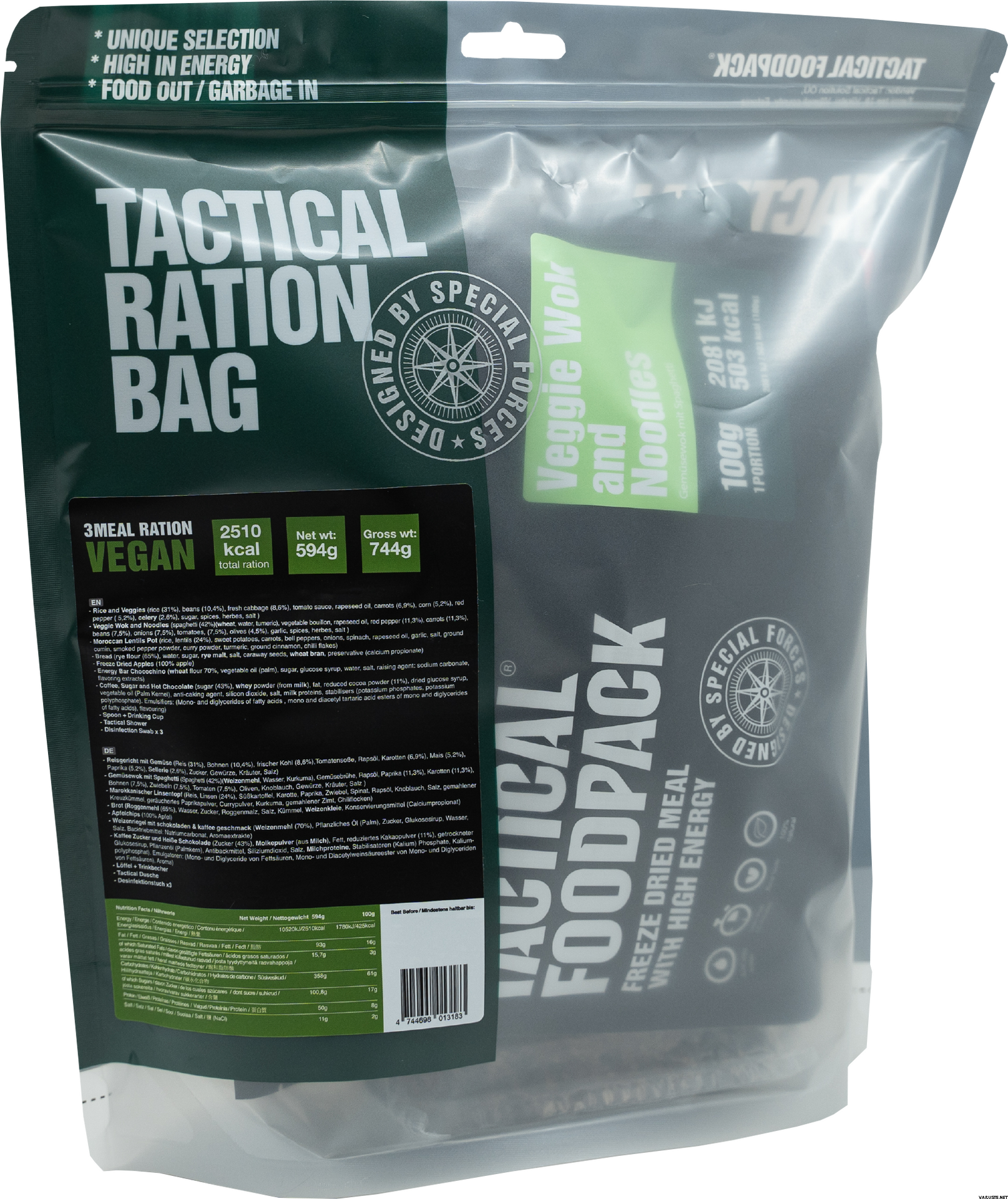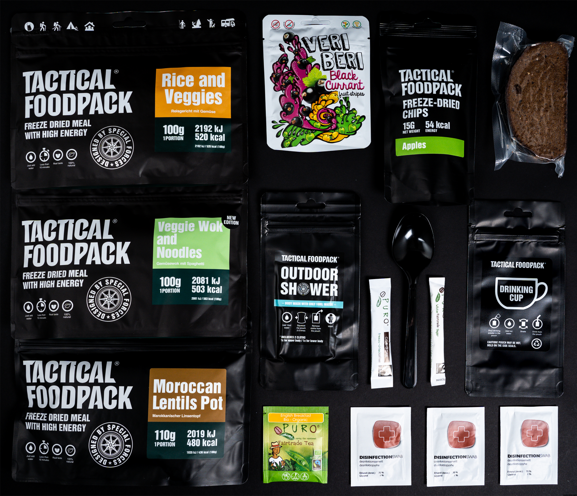 Vegan ration packs are available now! From Vegan 3 meal pack you can find Rice and Veggies, Veggie Wok and Noodles and Moroccan Lentils Pot. For snacks you can find rye bread, fruit stripes and freeze dried apple chips. Enjoy hot tea or coffee with your meals.