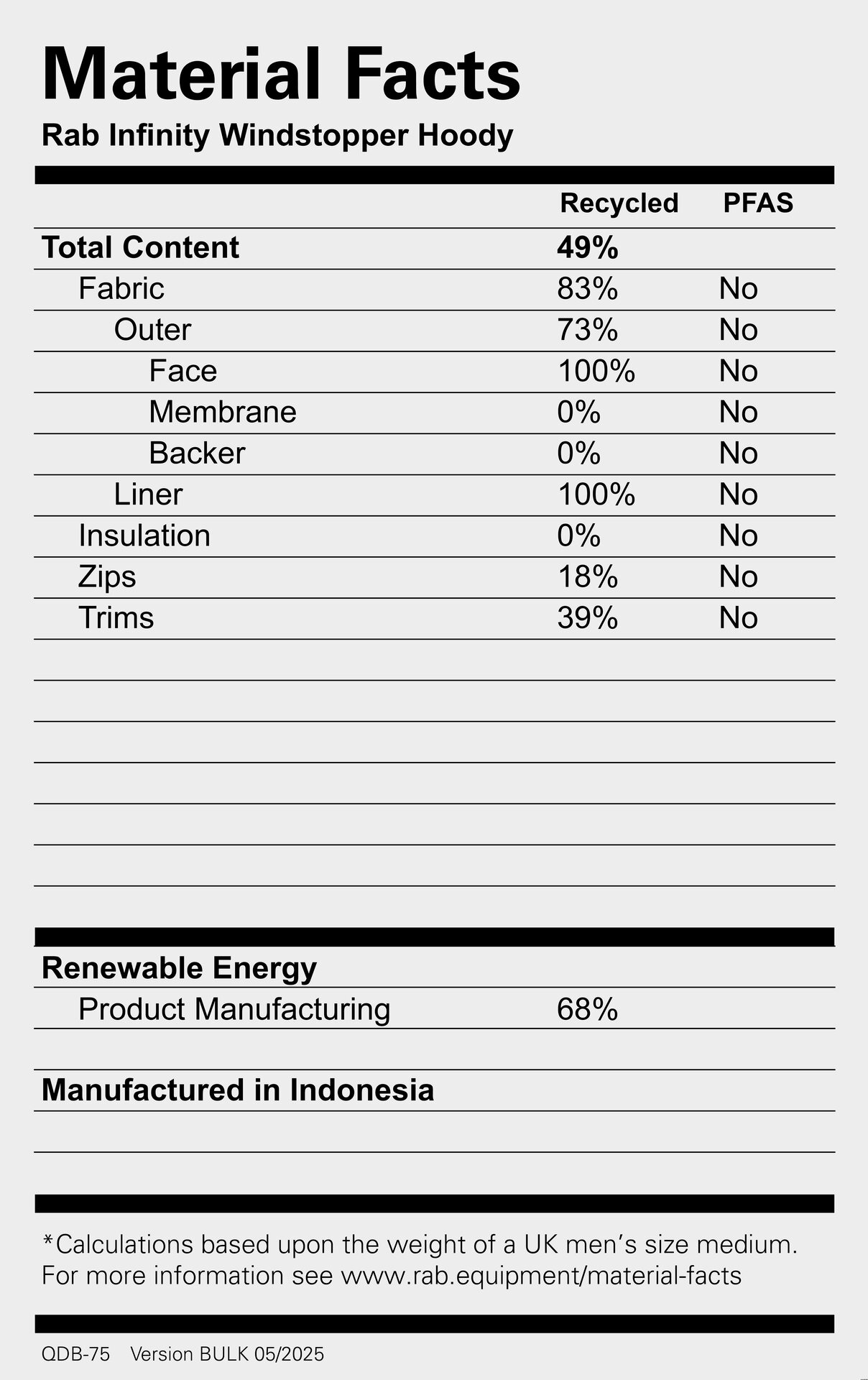 Hovedmateriale: 30D Windstopper fra Gore-Tex Labs med kulbrintefri DWR-behandling