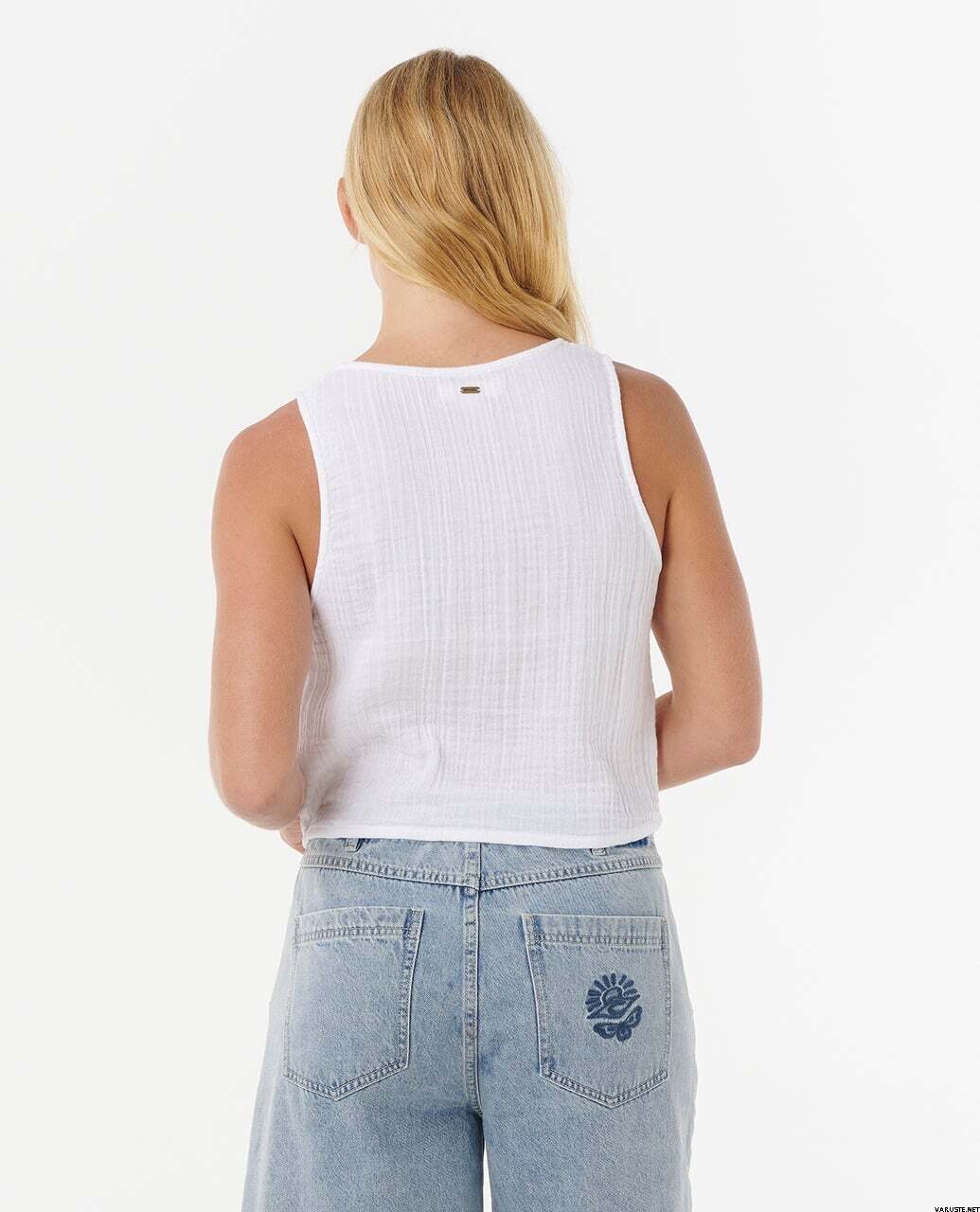 Rip Curl Premium Surf Top Womens giver luftig komfort i varmt vejr med en blød, tekstureret dobbeltvævet gaze-fornemmelse for et afslappet kystlook. Denne ærmeløse top fungerer godt som en hurtig cover-up efter en svømmetur eller som et simpelt hverdagslag med jeans. En fuld knaplukning foran og en diskret metallogodetalje fuldender den rene, afslappede stil.