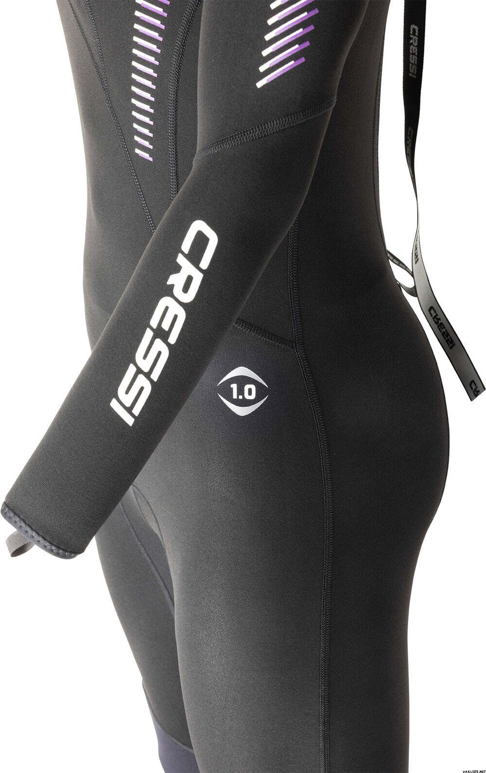 - Ultraspan neopren på arme og lægge for at øge strækbarheden, hvor mobilitet er mest nødvendig