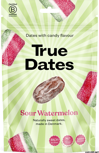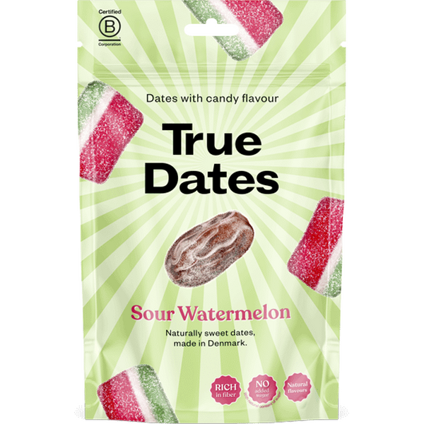 True Co. True Dates Sour Watermelon 100g leverer en lys sød-syrlig smag ved at kombinere naturligt søde dadler med et pift vandmelon-twist. Disse snacks er udstenede dadler, der er smagsat til at smage som sur vandmelon, hvilket gør dem nemme at nyde direkte fra posen. De tilbyder en sliklignende smagsprofil, samtidig med at ingrediensbasen er enkel og frugtagtig.