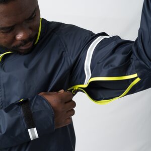 With 500 grams you get the full protection including a spacious hood in which the suit also stores itself. Two long 2-way-zippers, which extend from below the arms to the legs, take care of the temperature management and provide access to your normal pockets.