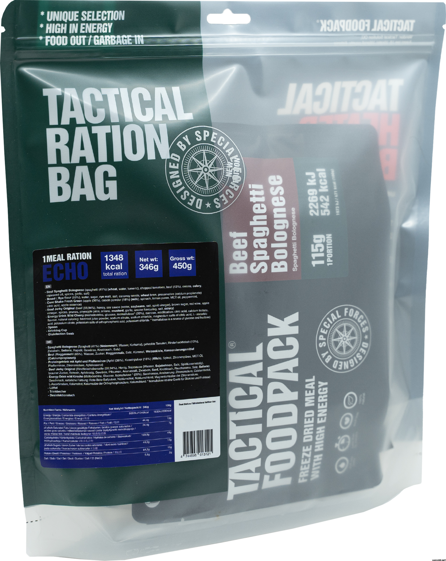 Die taktische Foodpack-Rationen Delta, Echo und Foxtrott sind für kurzfristige Herausforderungen konzipiert. Die Rationen umfassen eine Mahlzeit Tactical Foodpack, verschiedene Snacks und ein Energiegetränk. Zu den Extras gehören ein Löffel, ein Tactical Trinkbecher und ein desinfizierendes Handreinigungstuch. Der Rationsbeutel ist wiederverschließbar.