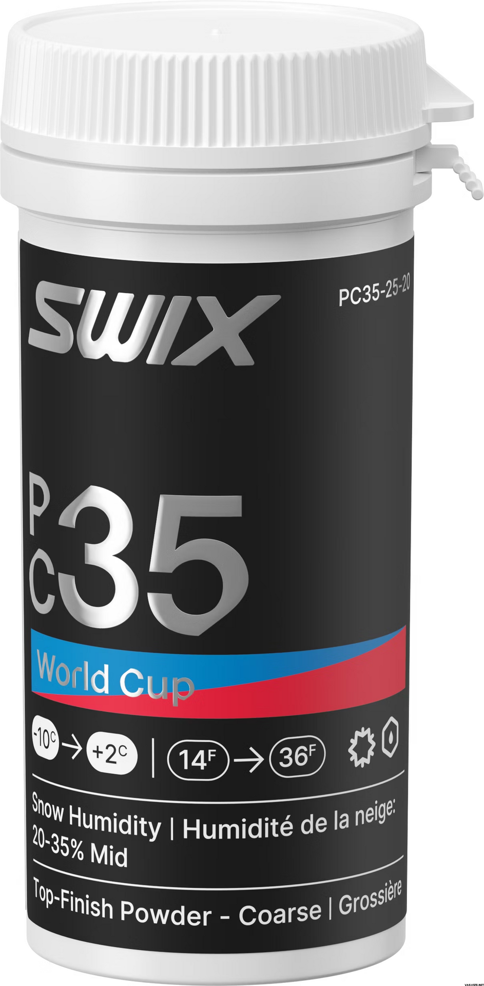 Swix World Cup Powder Coarse Mid, 20 g ist ein Premium-Pulverschnee für mitteltrockene, grobkörnige und veränderte Schneeverhältnisse. Dank der Swix Nano Contact Technologie entsteht eine nanostrukturierte Oberfläche, die die Reibung deutlich reduziert, indem die Kontaktfläche zwischen Skibelag und Schneekristallen minimiert wird. Das Ergebnis: verbessertes Gleiten und höhere Performance – ideal für Rennen. Optimale Leistung erzielt er bei einer Luftfeuchtigkeit zwischen 20 % und 35 %.