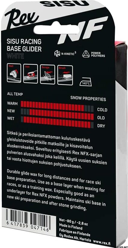 Das Rex NF Sisu Hard Black Racing Base Glider 80g ist ein robustes, fluorfreies Gleitwachs, das speziell für die Grundierung neuer und geschliffener Ski entwickelt wurde. Dieses Wachs auf Graphitbasis erzeugt eine widerstandsfähige Oberfläche, die allein oder als Basis für NFX-Pulver verwendet werden kann und sich besonders bei kaltem, frischem Schnee bewährt. Es ist ideal für raue und abrasive Bedingungen und verbessert die Gleiteigenschaften des Skis, indem es die Kontaktfläche wasserabweisender macht.