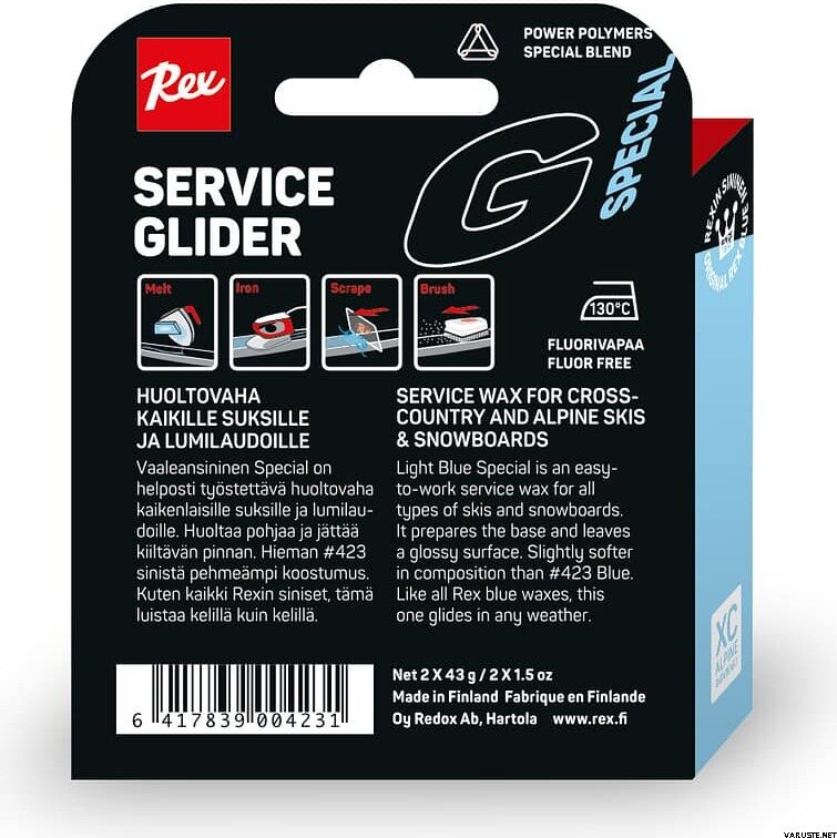 Rex Original Glider Light Blue Special Service 86 g ist ein fluorfreies Gleitwachs, das speziell für die Pflege von Ski und Snowboards entwickelt wurde. Das hellblaue Wachs lässt sich leicht auftragen und sorgt für ein glänzendes Finish. Es ist etwas weicher als das blaue Wachs Nr. 423 und bietet hervorragende Gleiteigenschaften bei allen Wetterbedingungen.