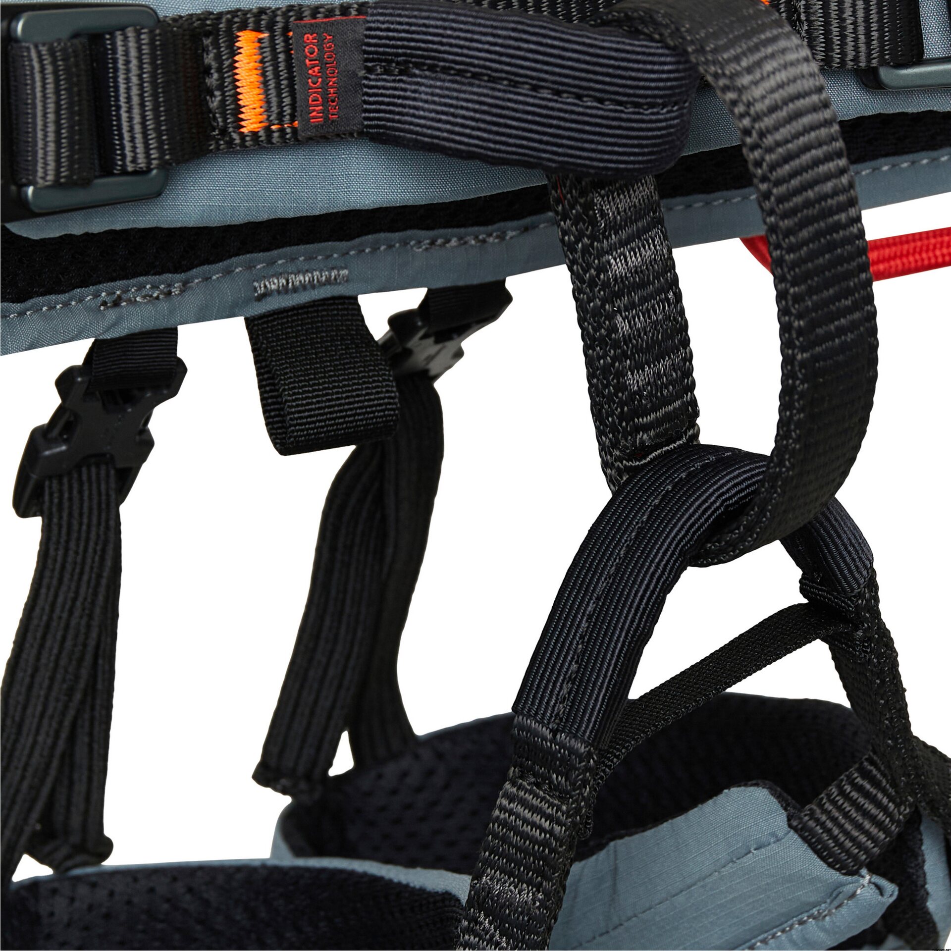 - Die geteilte Gurtbandkonstruktion verteilt die Last zwischen Hüft- und Beinschlaufen und reduziert so Druckstellen.