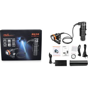 Product descriptionOrcaTorch D630 is a perfect canister dive light for cave diving, wreck diving or similar technical diving activities. The light delivers up to 4,000 lumens, and its angle adjustable cable allows both 90°and 180° rotation between canister and light head. This makes the OrcaTorch D630 perfectly suited for both side mount and back mount diving. Its large-capacity battery pack provides up to 5 hours of excellent diving experience at the brightest mode. The battery pack can also be taken out and used as a power bank.