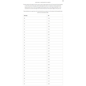To easily measure the length of the foot, place a piece of paper against the wall. Then place the foot (barefoot or with a thin sock) on the paper with the heel against the wall. It is important to stand upright when measuring. Put a line in front of the longest toe and measure with a ruler. Measure both feet; it is not uncommon for one foot to be larger than the other. Round up to the nearest integer to find your size. These methods act as supervisors. It is recommended that you always try on the shoes to find the perfect boot and fit as no two feet are alike.