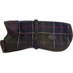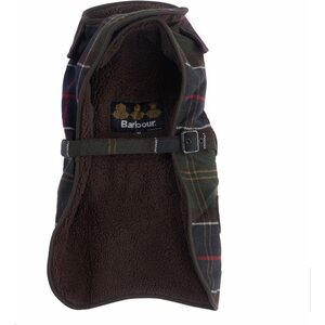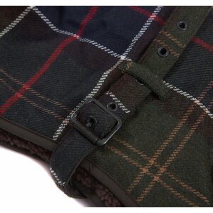 Soft and warm wool-touch Barbour tartan dog jacket lined in Berber fleece with a cord collar and Velcro fastening straps. With key hole opening for harness.