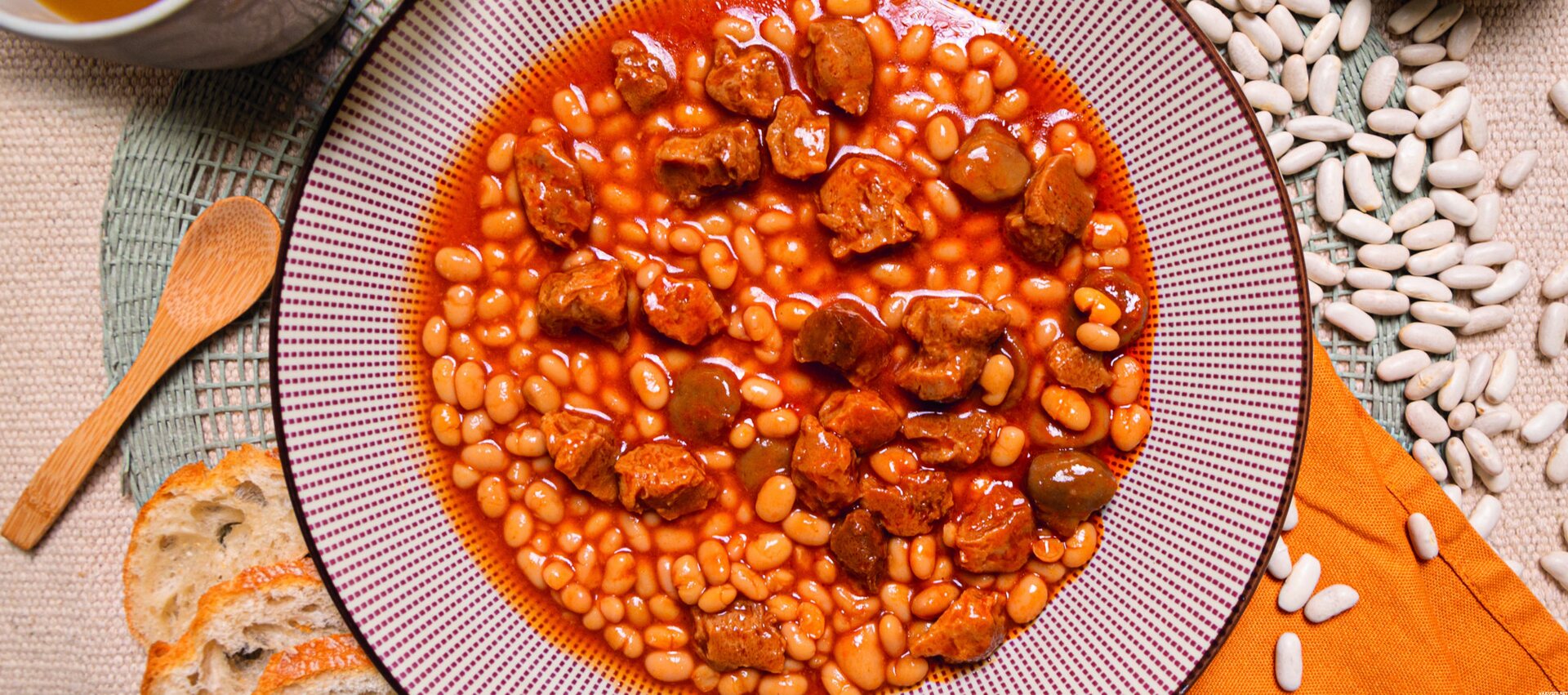 White beans 32%, textured soy protein 25%, water, mushrooms 15%, tomato concentrate, sugar, sunflower oil, salt, wheat flour, apple cider vinegar (contains sulphites) and pepper.