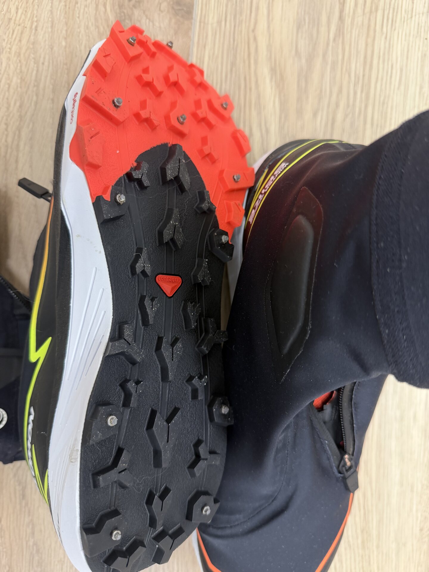 Built onto a springy, cushioned midsole using Energy Foam for a fluid and dynamic running experience. Winter Contagrip compound in the outsole combined with carbide spikes ensures maximum adhesive grip. Features a protective gaiter with the dual task of protecting your feet from debris and maintaining breathability in dry conditions.
