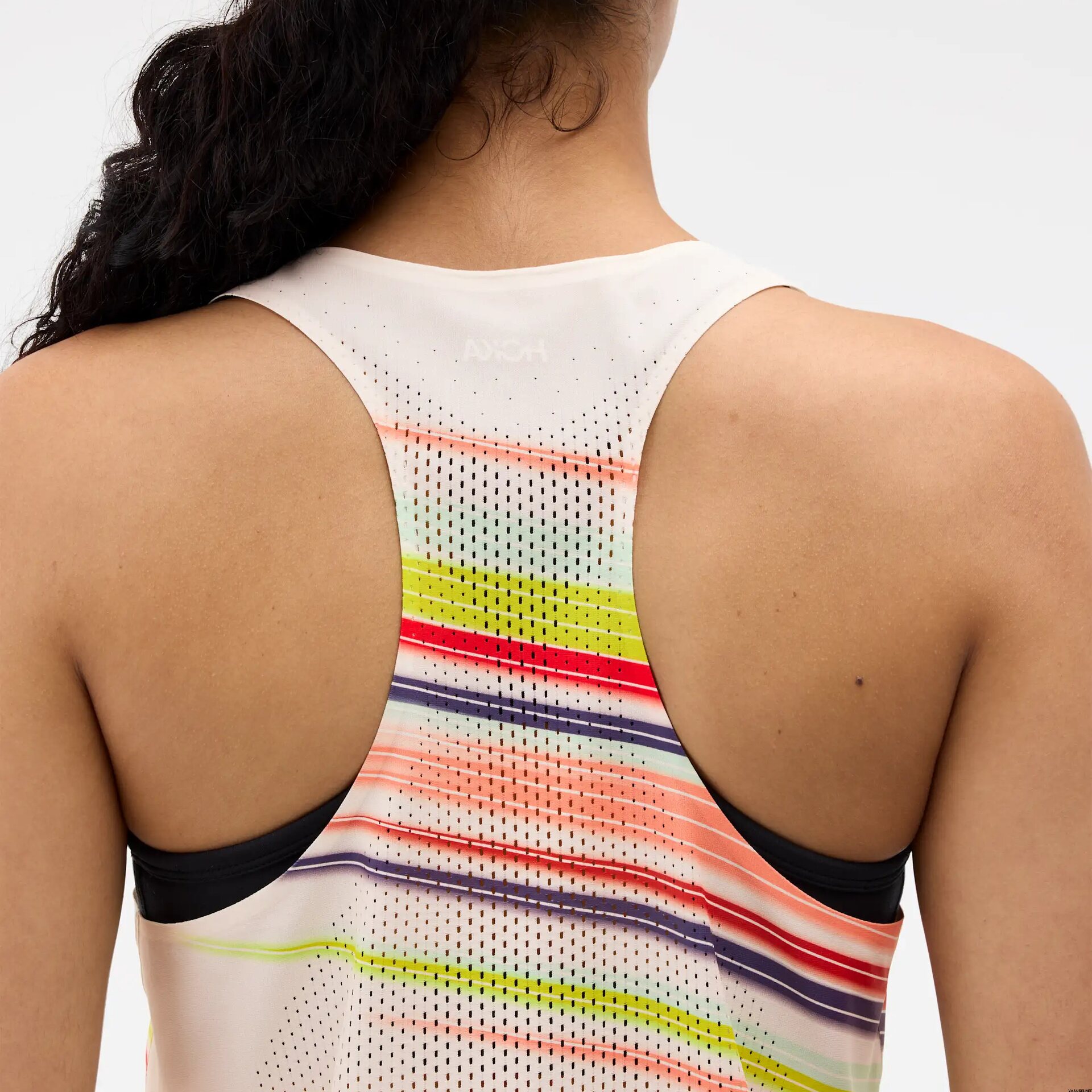 Hoka Race Day Singlet Womens is a featherlight, highly breathable running singlet built for race-pace efforts with fast-drying jacquard knit. Developed with input from elite Hoka athletes, it supports smooth movement with well-placed side vents and a streamlined feel. Anti-chafe finishing and an extended neck opening help reduce irritation on hard workouts and competition days.