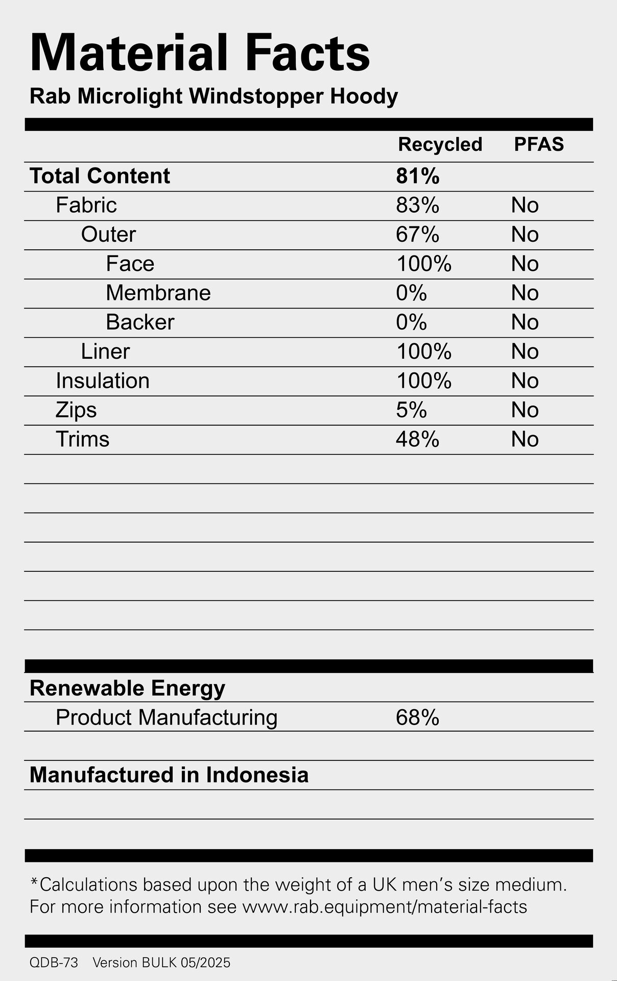 The Rab Microlight Windstopper Hoody Mens is a highly protective version of the classic lightweight and packable men's down jacket, crafted to effectively block wind. This jacket is perfect for activities like climbing, hill walking, and mountaineering, offering warmth and breathability with its advanced materials. Its slim fit and compressibility make it an excellent choice for year-round mountain adventures, providing warmth and mobility where needed most.