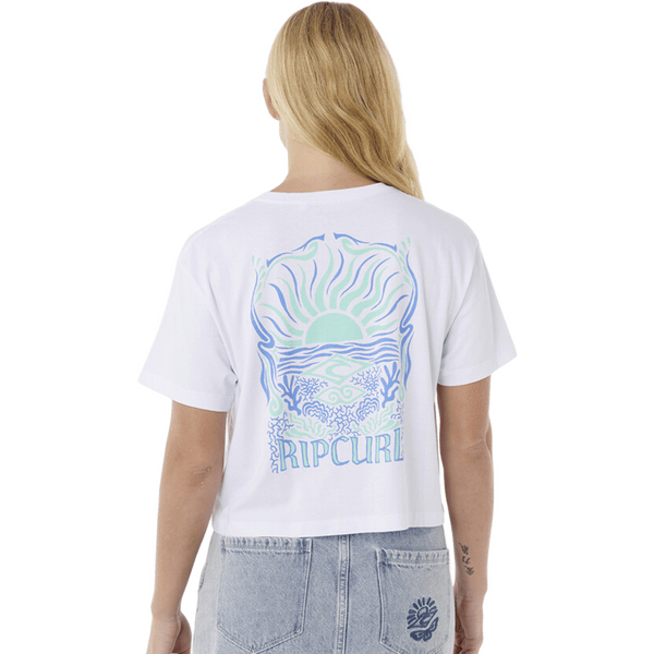 The Rip Curl Sunrise Crop Tee Womens captures the essence of post-surf relaxation with its boxy cropped design. Crafted from soft cotton jersey, this tee features a stone-washed finish for a comfortable, lived-in feel. The front and back graphics add a vibrant touch, while the woven flag label and inner neck print complete the look.