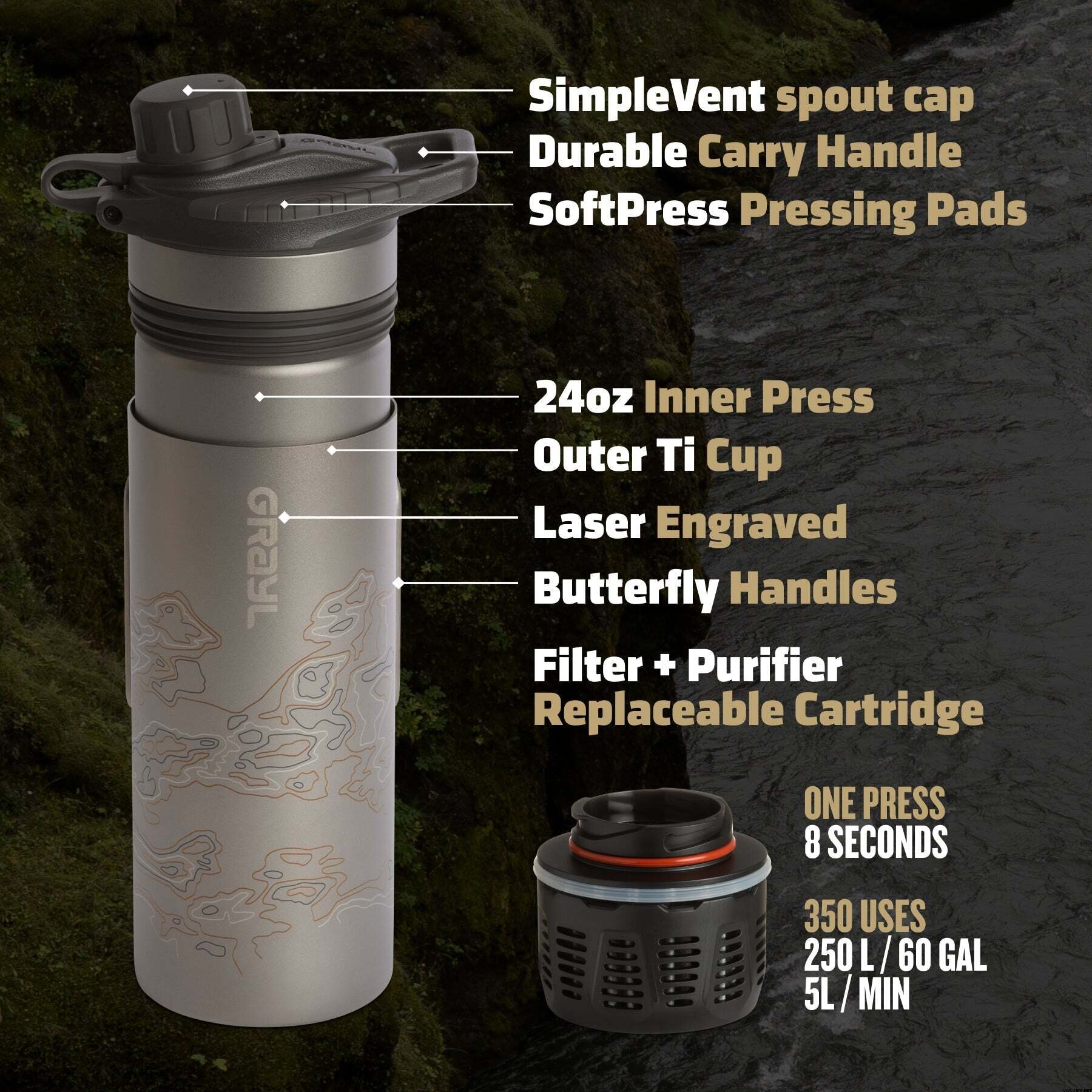 The Grayl 710ml GeoPress Titanum Purifier with Cook Lid is a top-tier water purifier designed for adventurers and travelers. This compact bottle combines the functions of a water collector, filter, purifier, drinking vessel, and cook pot. Made from high-quality CP4 Grade 1 titanium, it offers durability and efficiency, making it an essential tool for outdoor activities. With its OnePress global purification capabilities, it ensures safe drinking water from virtually any freshwater source.