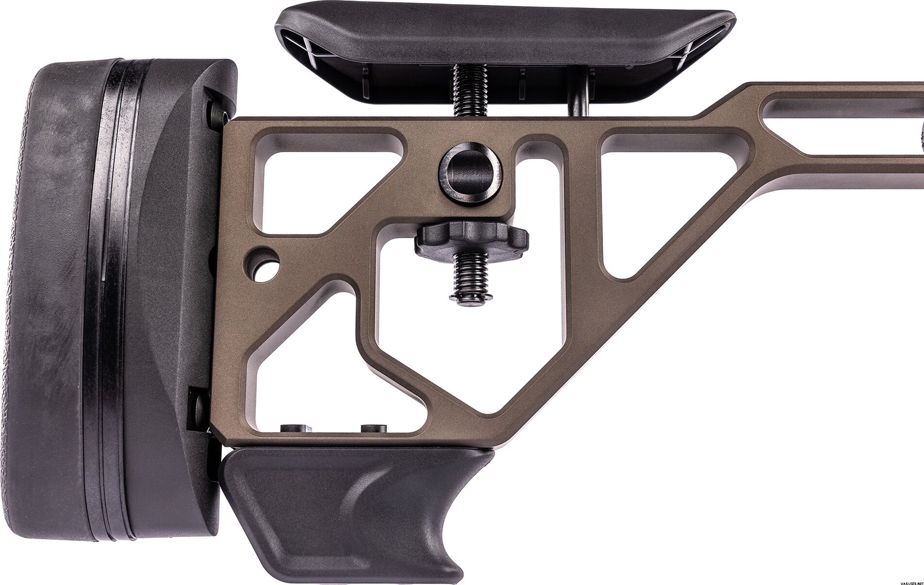The rifle's adjustable stock ensures a comfortable and stable shooting position, with full customization to suit personal preferences. Length of pull, cheek piece, and butt plate are all adjustable to meet the shooter's needs. The skeletonized rear stock allows for the attachment of additional weights to stabilize the rifle. Additionally, the adjustable, ambidextrous thumb rest improves support for the shooting hand, particularly when shooting from a prone position. The angle and position of the pistol grip are also adjustable, ensuring the trigger is perfectly positioned. The pistol grip is AR-compatible, further increasing customization options.