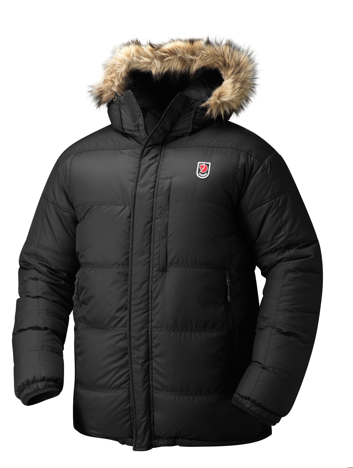 A fixed, adjustable hood keeps the cold at bay and the de-tachable synthetic fur trim offers protection from the snow. As an added safety measure, there is also a reflective stripe on the back of the hood. The pocket openings are oversized and the zipper pulls are large to accommodate bulky gloves. In addition to the side pockets, there are also two inner mesh pockets and a vertical breast pocket.