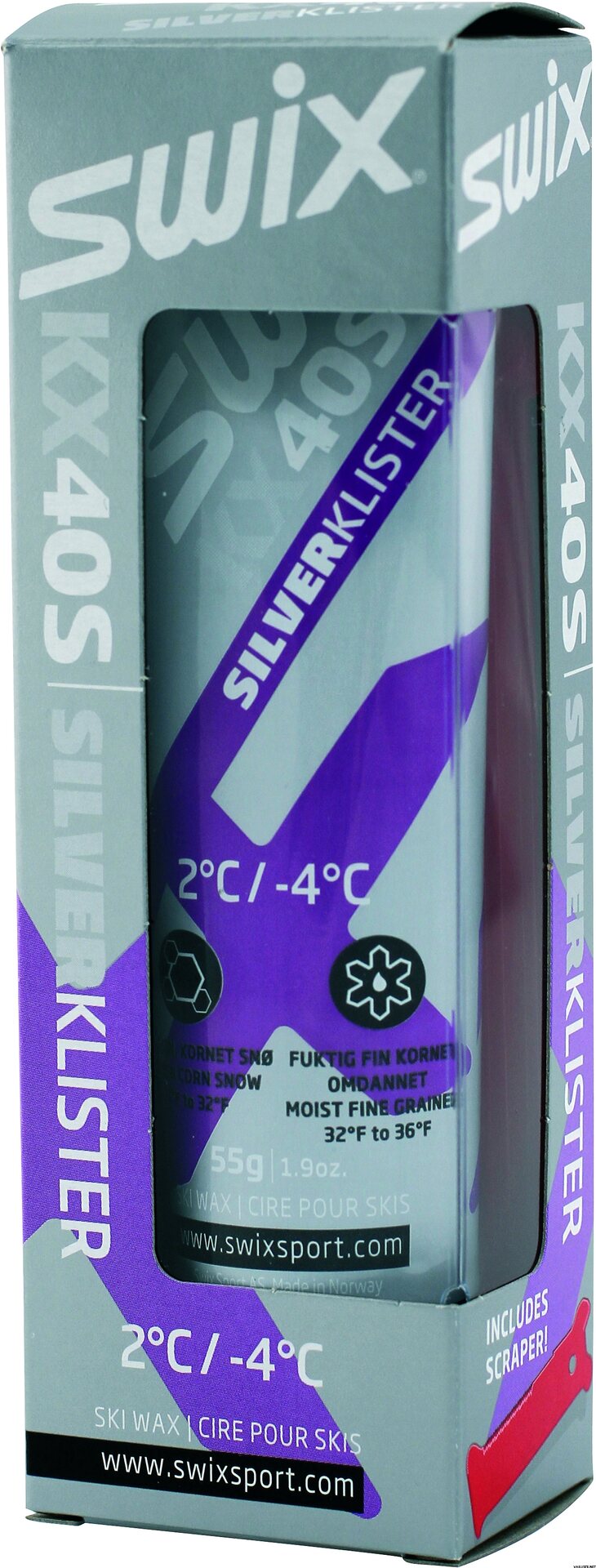 Developed for transformed and fine grained snow. Very good when warmer than 0°C and relatively fine grained snow. The klister that goes the farthest into dry snow without icing! Scraper included.
