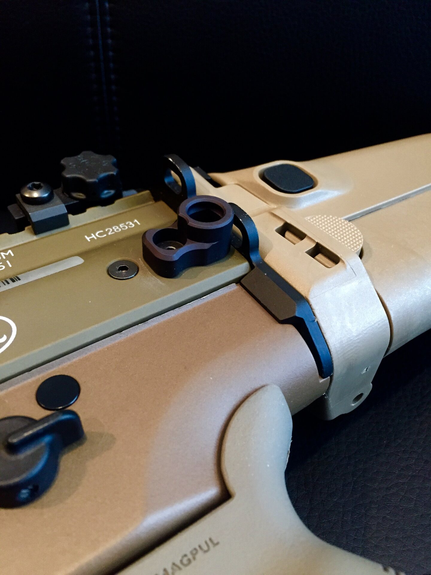 Product descriptionSince the factory stock and backend of the SCAR platform provides no QD points, KDG developed the Kinetic Rear QD Point (KRQP). Our reduced profile Rear QD point attaches in minutes with no dis-assembly of the rifle. It can be installed on either side of the rifle, and tightly hugs the rear lower HK style factory attachment loop. This is the ideal sling mounting point for those who prefer utilizing a single point QD mounted Sling, but works equally well for those who wish to run a two point sling off the rear of the receiver. Like our Front Ambi QD Point, the Rear QD point is rotation limited and keeps a factory OEM look to your SCAR.