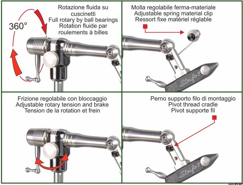 Product descriptionHigh quality in-line 360° rotary action vise for tying flies and streamers. The stainless steel shaft rotates through two precision ball bearings. The shank of the hook rotates on axis thanks to the adjustable shaft. The steady pedestal base has a useful integrated tool rack and connection for magnifying glass item 642 (tools and magnifying glass not included). Other important features: interchangeable jaws, hook locking by "super soft" lever device, adjustable rotary tension, smooth rotary motion, locking position at any angle, adjustable height, reversible for left hand tying. Other accessories included: rounded shape bobbin cradle, parachute plier, adjustable spring material clip, pivot thread cradle, allen keys and instruction manual.