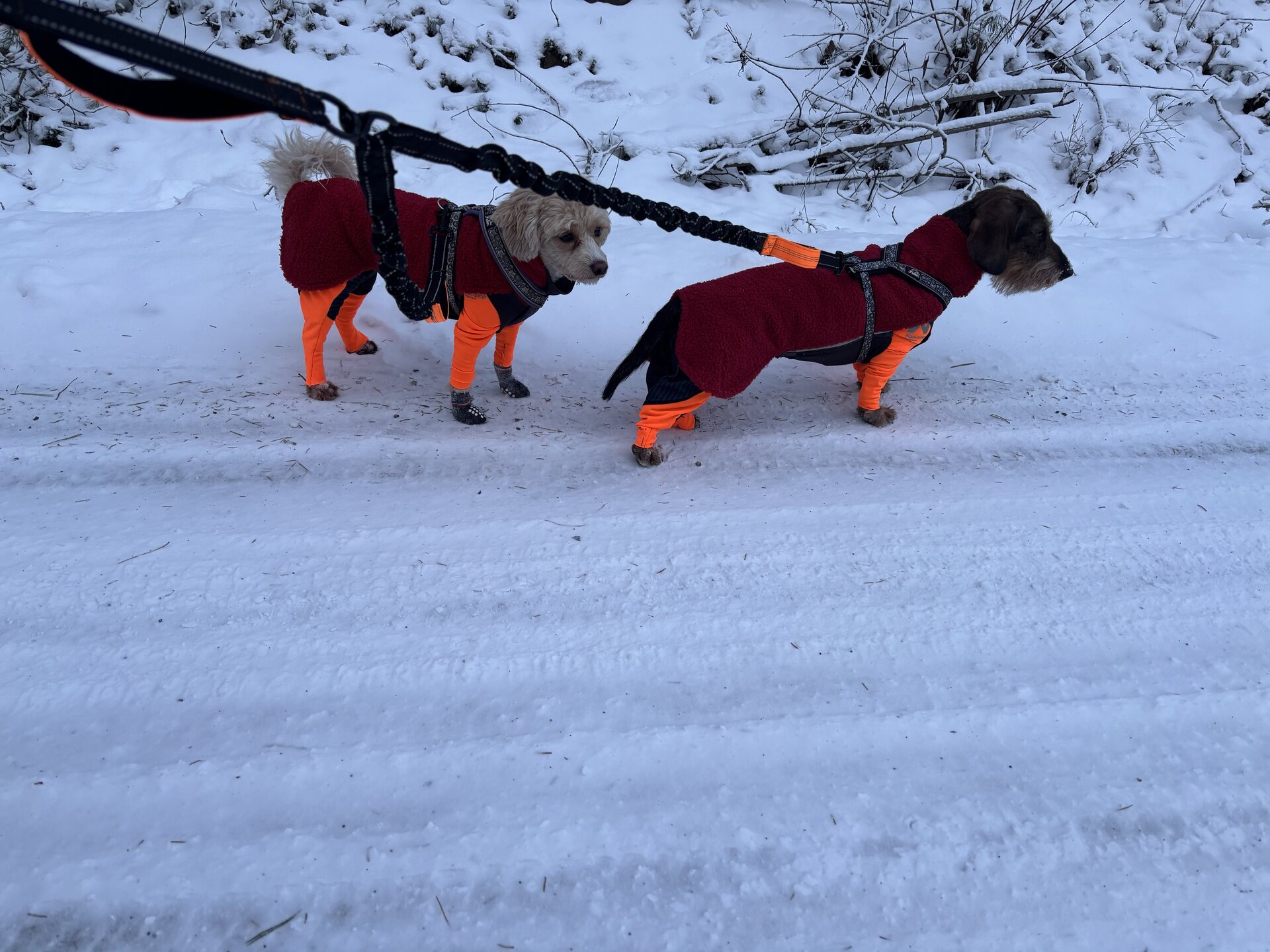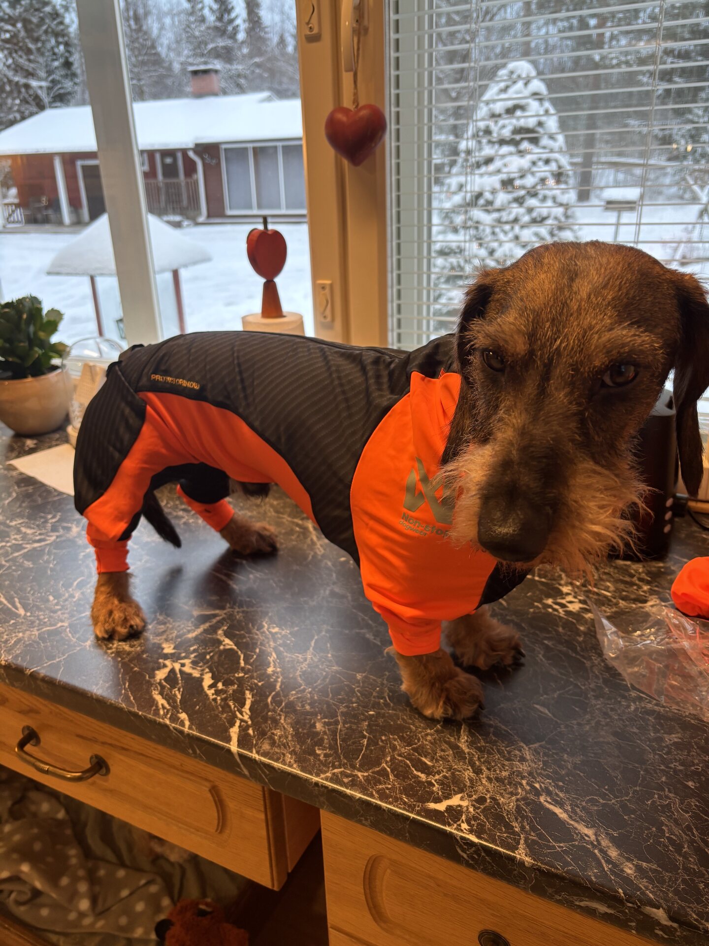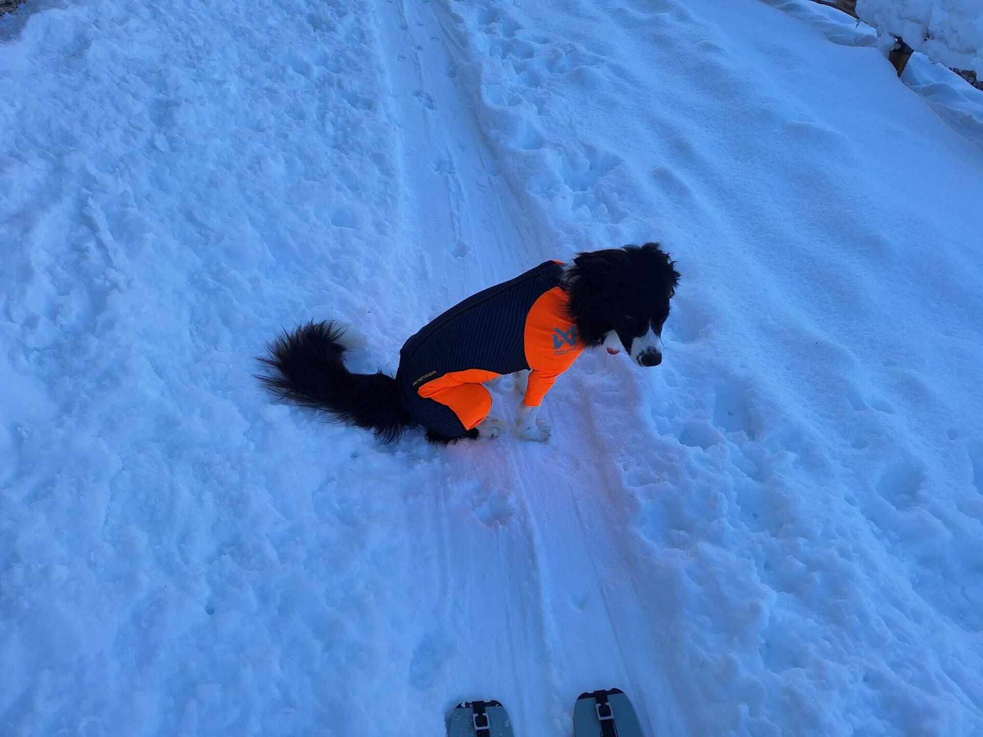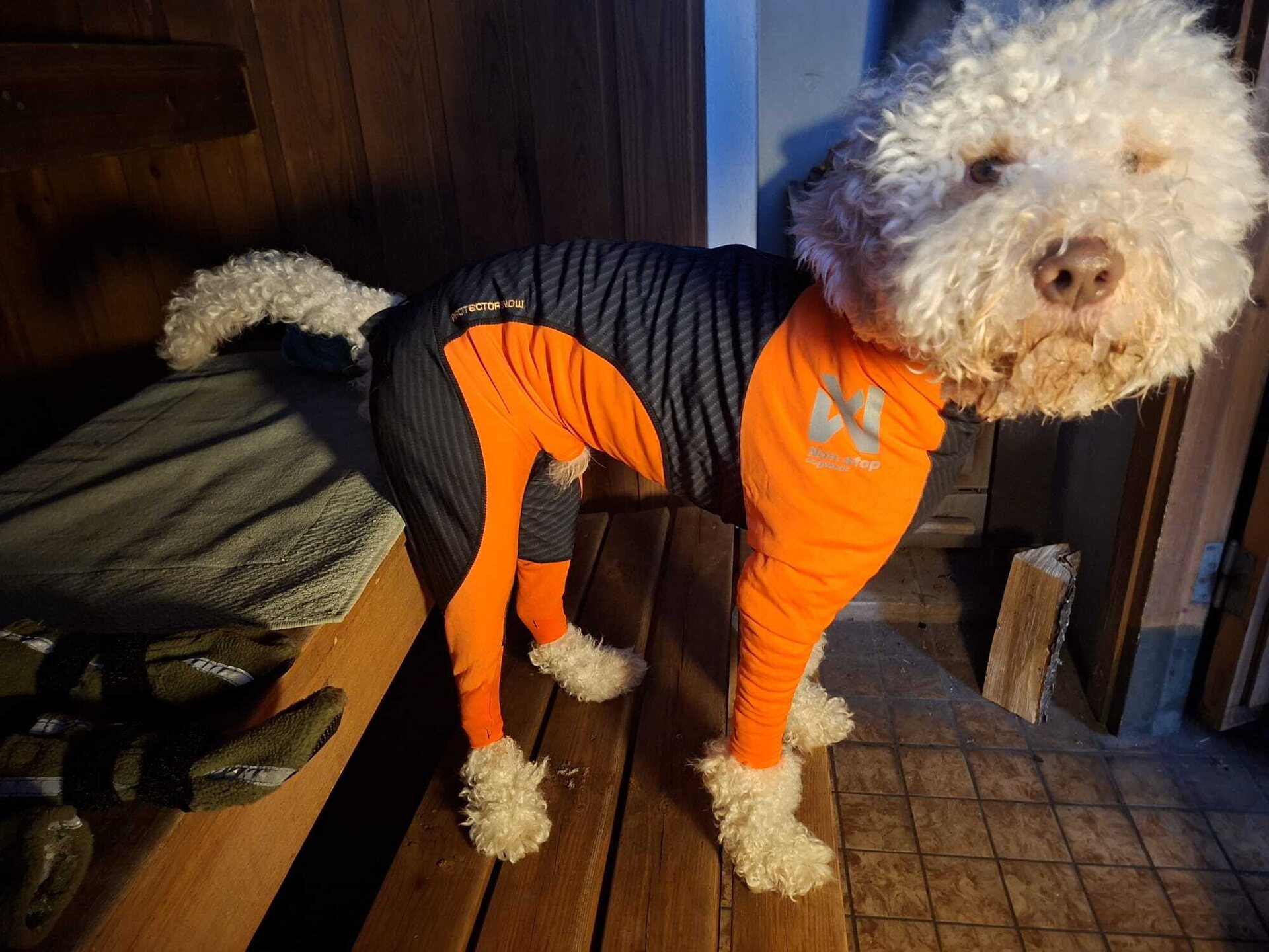 Product descriptionNon-stop Dogwear Protector Snow is a full-back cover made from thin and elastic fabric. The suit protects dogs during activity involving snow, ice, cold and wind. The suit is form-fitting and should sit tight, the elastic fabric gives the dog great freedom of movement and is ideal for use in the mountains or arctic tracks. It should not be used in forest and scrub, then the fabric will crack. Be aware that the suit should sit tight and that the legs are not too long. Protector Snow comes in two varieties, female and male. The orange color and reflective stripes make the suit incredibly visible.