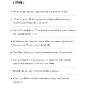 Product descriptionOne of the Camelback's most popular running vest is now available with a women's specific fit! The Women's Circuit Vest includes a 1.5-liter CRUX reservoir that delivers 20% more water per sip and is lightweight for logging tons of miles. Designed specifically for women, the front panels include four different soft flask sized pockets so you can customize where you carry additional hydration or gear. The secure zippered pocket fits most smartphones, while reflective accents keep you visible during all hours of training. With a one-size-fits-most design, the side compression is highly adjustable to ensure a stable fit over any terrain. The Women's Circuit Vest is certain to become one of your most versatile and trusted training partners.