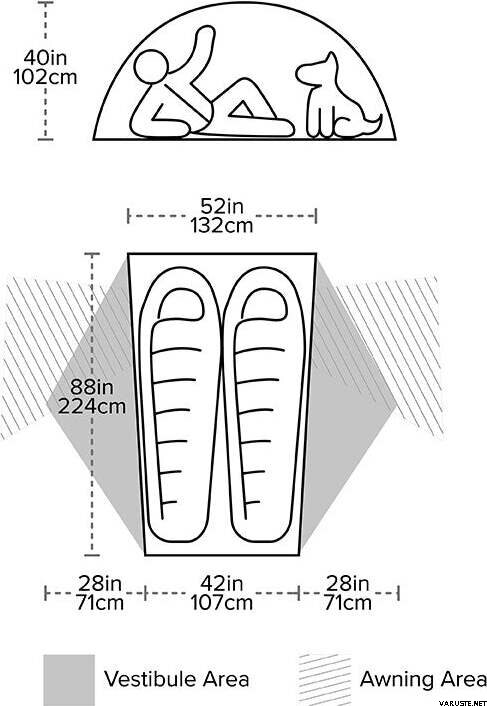 Rainfly + Floor: patenteeritud Hyperbead kangatehnoloogia; 15D nailonist rebenemisvastane kangas 20D lahuses värvitud rebenemisvastase võrega ja 1500 mm veekindlusega ilma tahtlikult lisatud PFAS-ita