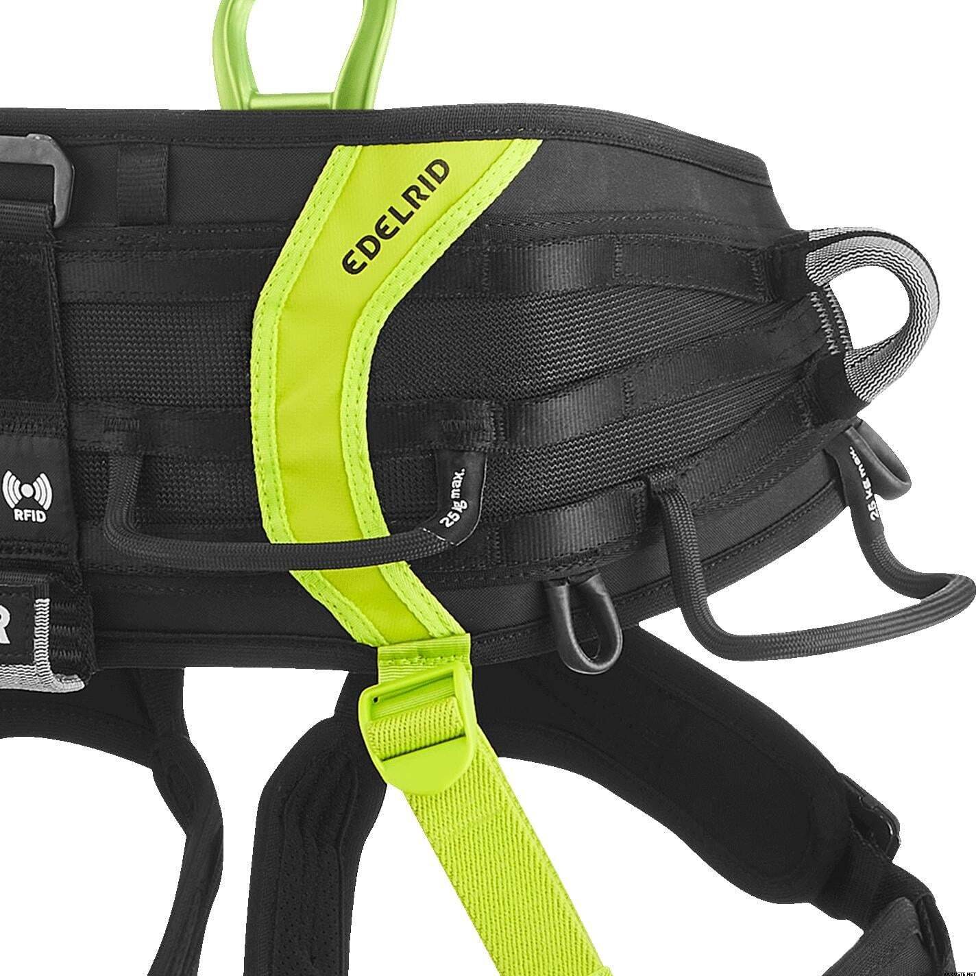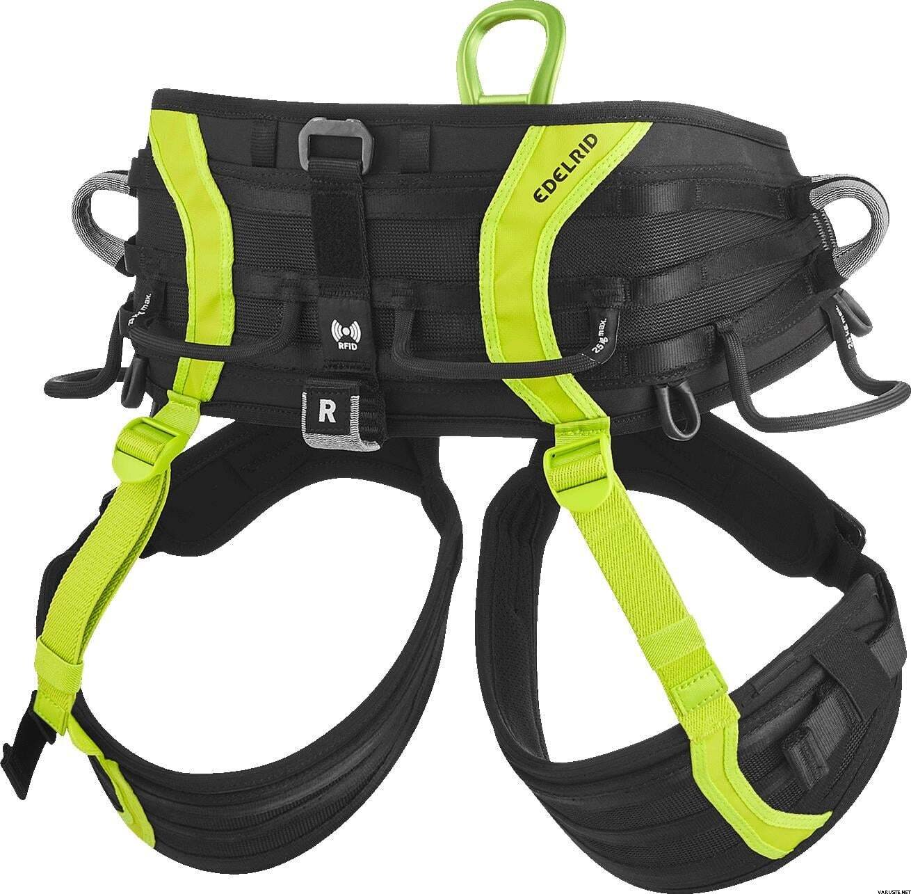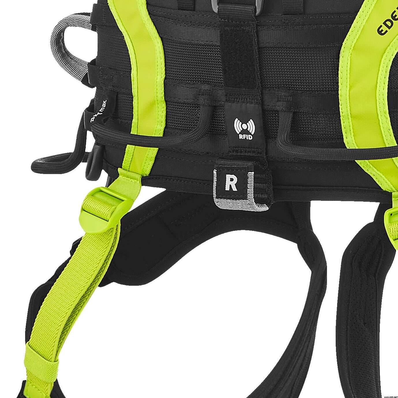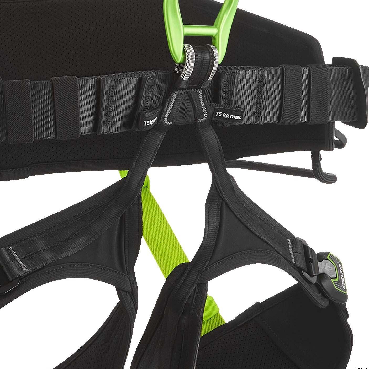 - Neli suurt hõõrdumiskindlat varustusaasa kuni 25 kg kandevõimega, ruumi kuni 12 karabiinile aasa kohta
