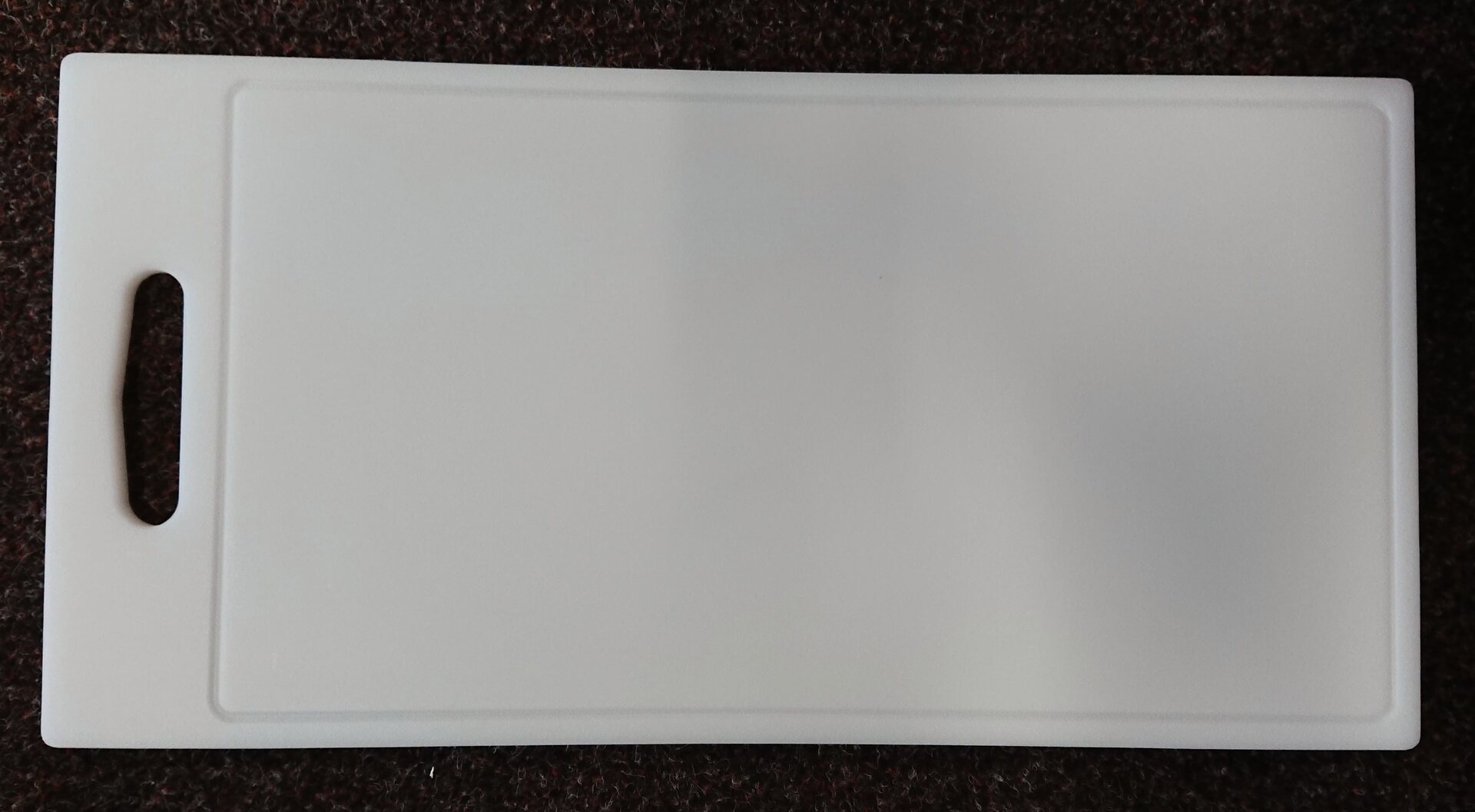 This plastic chopping board has rounded edges and handle for easy handling. It has handy groove on the sides.