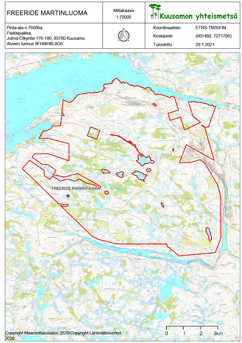 Kuusamon yhteismetsän Freeride- moottorikelkkailulupa: Ölkyn Martinluoman palstan lupa-alue, noin 7 600 ha.