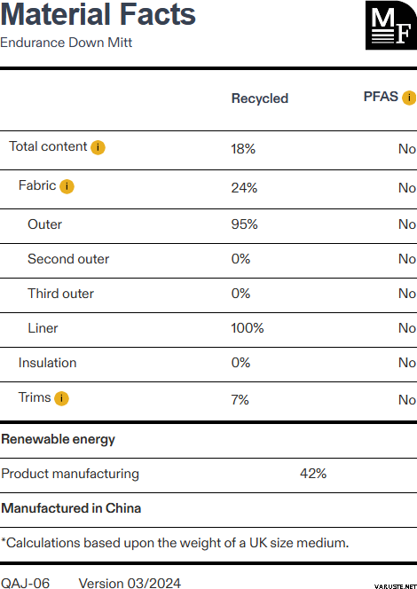 Az Endurance Down Mitt egy könnyű, 252 g súlyú kesztyű, 650 FP kacsatollnal töltve, kellemes meleget biztosítva a kezének nagy magasságban vagy sarki expedíciókon. A szintetikus Stratus™ szigetelés az oldalfalon, a tenyérben és a hüvelykujj belső oldalán rugalmas és gyorsan száradó, nedves körülmények között is jól megbirkózik a nedvességgel. 100%-ban újrahasznosított, vízálló Pertex® Quantum Pro bevonattal vannak ellátva, amely könnyen ellenáll az enyhe esőnek, hónak és szélnek, hogy az ujjait szárazon és pirítósan tartsa.