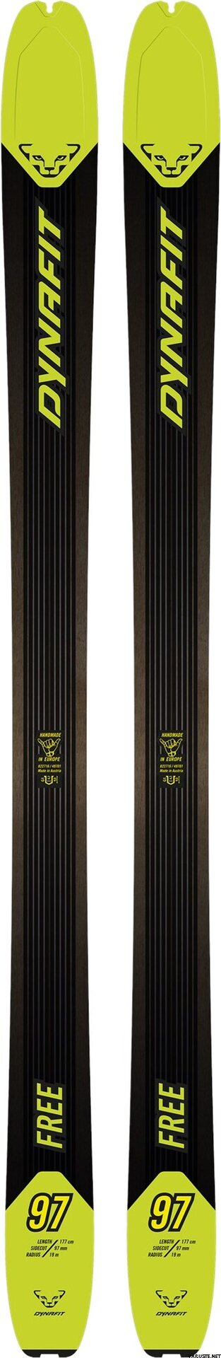 Playful, nimble and still stable, too – the Free 97 touring skis for men make the pulse of freeskiers race. It magically creates the purest skiing fun in diverse conditions. Their light construction with 100% poplar wood core and the time-tested Dynafit carbon speed stringers allows you to save your energy on the climb so you can give it your all on the descent. A modern sidecut and the rocker at the tip and tail together with a balanced flex for optimum performance characteristics transform these skis into the perfect companion for untouched powder, steep couloirs, and diverse descents. Even in demanding ski conditions or when wearing a heavy backpack, you maintain full control and execute perfect ski turns. The slightly raised tip lends improved turn initiation and easy float. The full sidewalls guarantee direct power transfer to the edges for best performance and stability on both soft snow and hardpack.