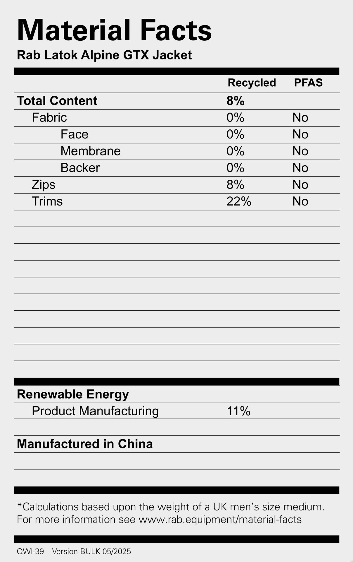 Fő anyag: 40D 3 rétegű Gore-Tex Pro termékek ePE membránnal és PFCecFree DWR-rel (98 g/m²)