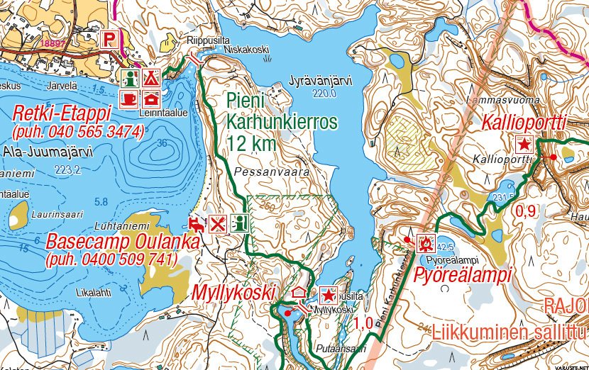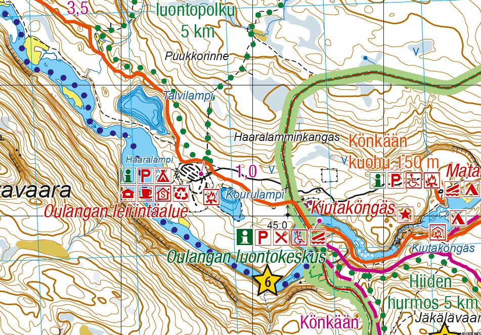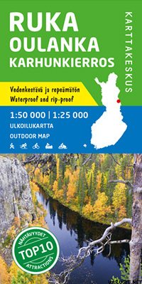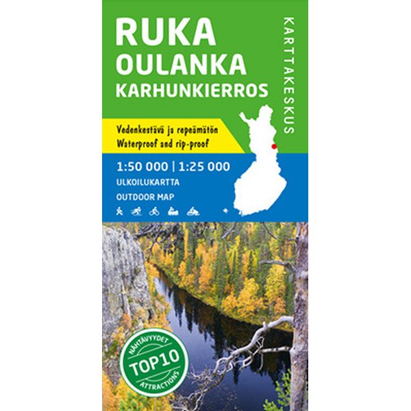 Kaksipuolinen kartta kattaa Kuusamon upeimmat retkiseudut. Sen alueella on muun muassa huippusuosittu vaellusreitti Karhunkierros, koko Oulangan kansallispuisto, Rukan matkailukeskuksen ympäristön päiväretkireitit ja ladut sekä Kuusinkijoen houkuttelevat kalastuskohteet. Kartan avulla löydät parhaat nähtävyydet: Kitkajoen kosket, kallioiset vaarat, Kiutakönkään putous sekä ympäröivät laajat erämaat ovat kaikki ulottuvillasi. Uutuutena parhaista päiväretkikohteista on mukana tarkemmat karttaotteet.