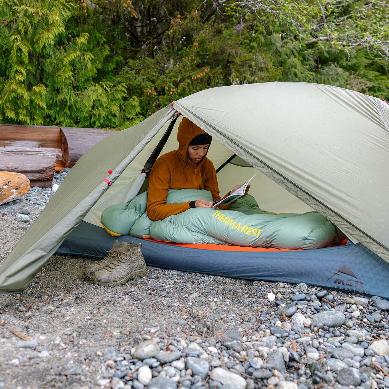 Dopo averne usati un paio una volta, un'ottima alternativa al sacco a pelo! Piacevolmente caldo e avvolgente. Nella fase centrale si trovano due cosiddetti lacci flessibili che possono essere tirati da sotto il materassino e fissati con un bottone a pressione, così rimane meglio al posto del letto. Al collo è presente anche una chiusura a scatto che può essere messa attorno al collo per tenerlo meglio addosso durante il sonno. Secondo la mia esperienza, non c'era alcuna sensazione di soffocamento. Viene fornito con una borsa di compressione e una borsa più ampia per riporla.