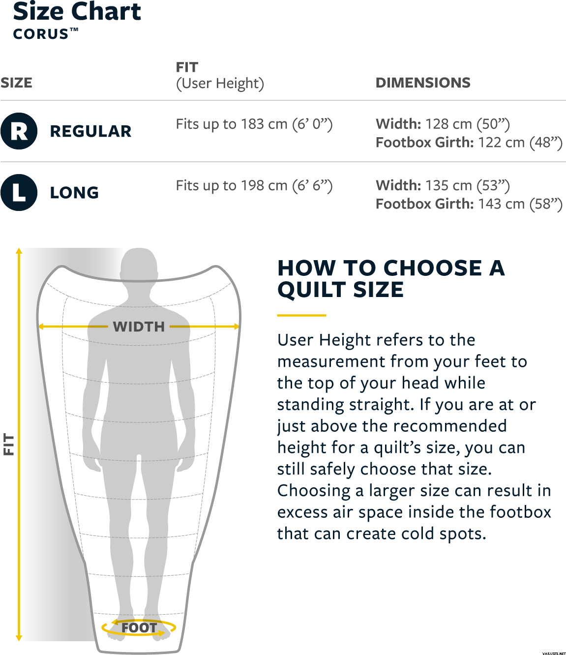 Circonferenza (spalle/fianchi/area piedi): Regolare: 125/121/130 cm (49/47,5/51 pollici), Lunga: 135/131/160 cm (53/51,5/63 pollici)