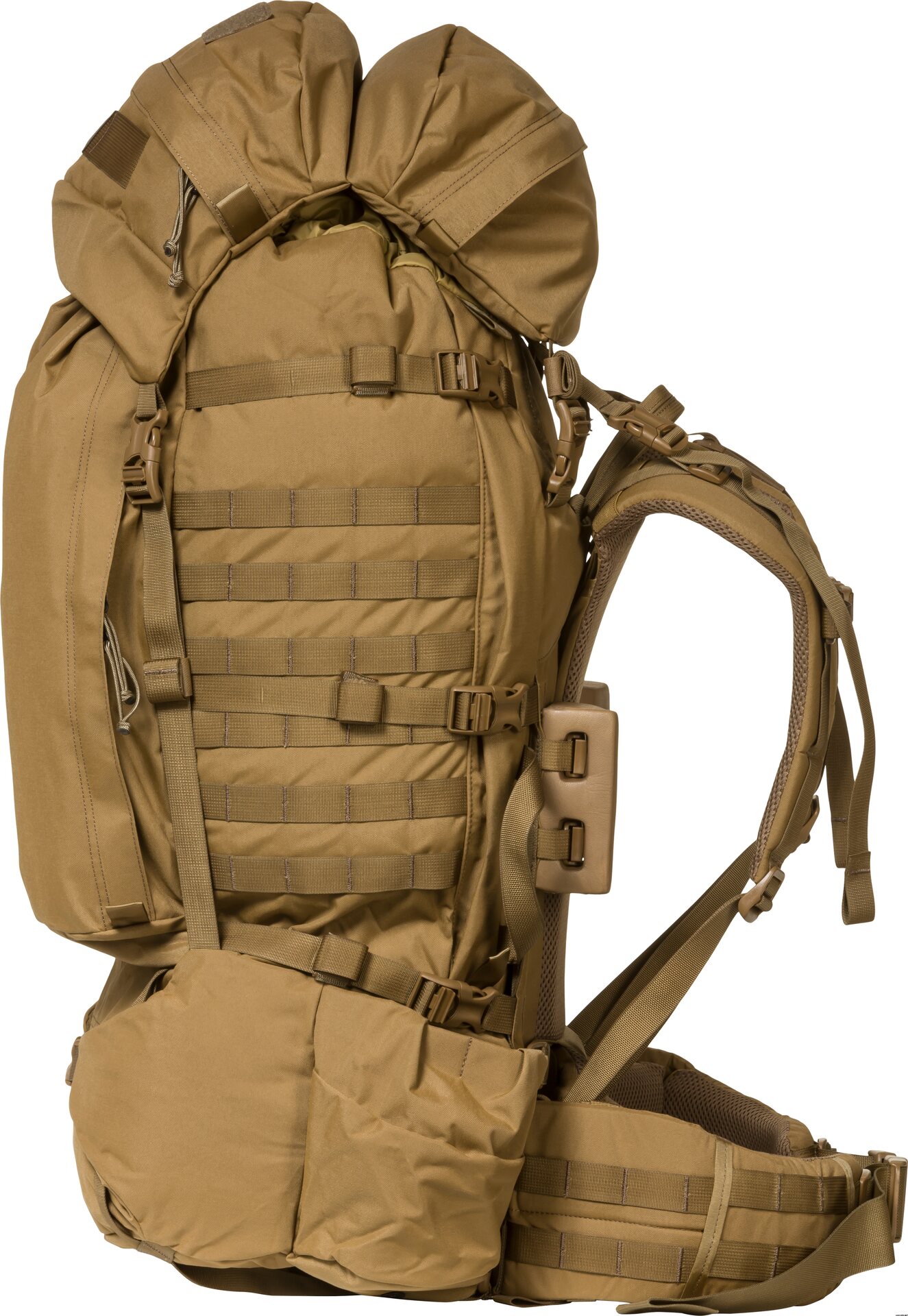 For extended Recce missions or bulkier items, the NICE 6500 is our classic top-loading pack. This bag has enough features to organize the largest loads and seven rows of PALS webbing on each side for your own additions. Two long vertical pockets on the front allow quick access to scopes, headlamps, food, ammo, etc. Side zippers get you into the main bag without having to dig down through the top. The bottom part of the pack is our SpeedZip sleeping bag compartment. The 900 cu in Daypack lid is removable and also its own backpack.