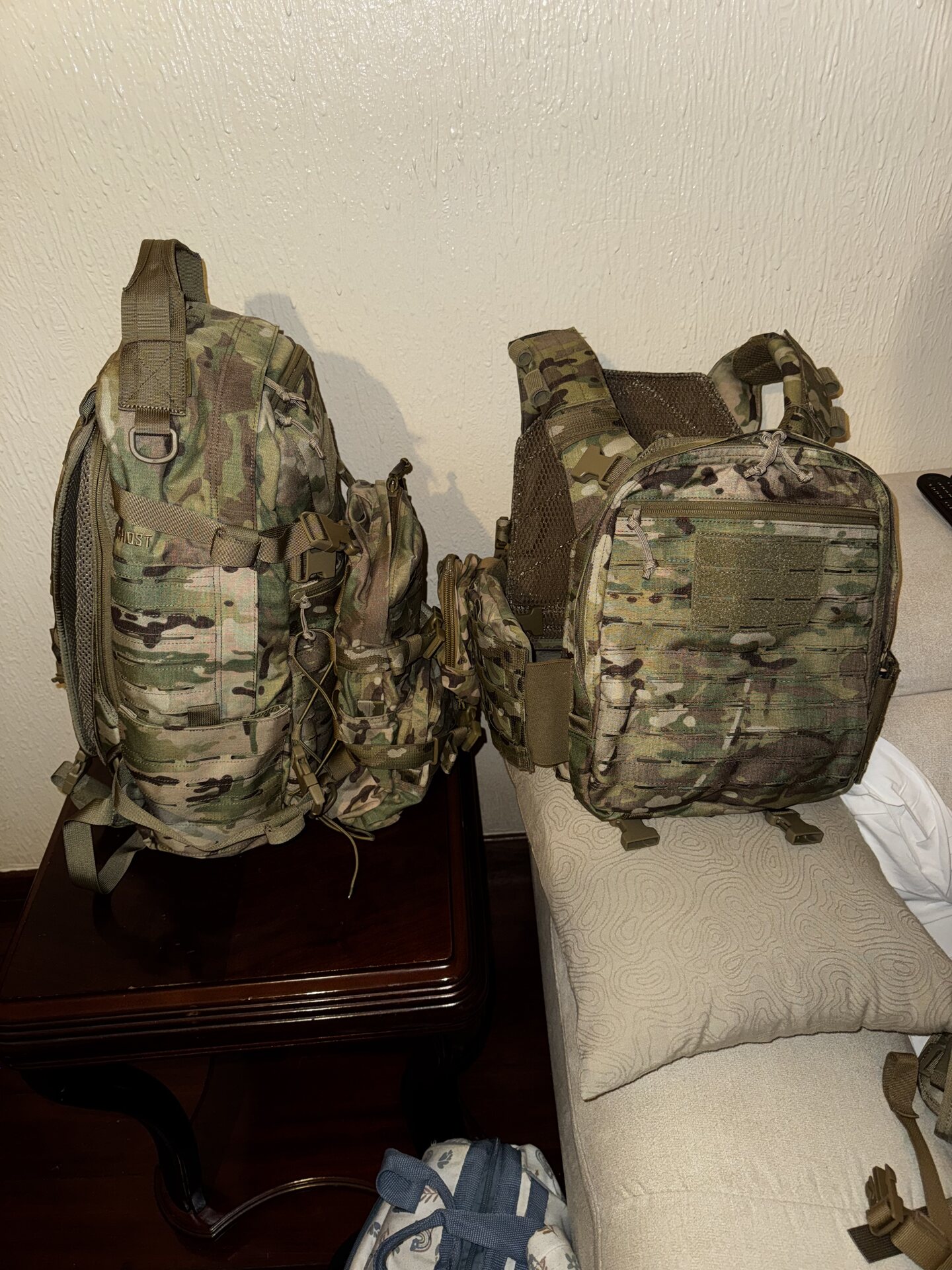 Lo zaino Ghost è uno zaino da 31+ litri, 3 giorni, adatto sia per pattugliamento che per operazioni tattiche avanzate. È dotato di due tasche per sacca di idratazione, una nello scomparto principale con uscita centrale per tubo e un'altra nella sezione posteriore con cerniera. La tasca per idratazione dello scomparto principale può anche contenere dispositivi radio multibanda o un laptop fino a 15". Lo zaino include una tasca esterna con un organizer interno, attaccato tramite corde elastiche, che consente di attaccare oggetti come impermeabili o un casco tra la tasca e lo zaino. Questa tasca esterna può essere staccata e utilizzata separatamente o montata su qualsiasi equipaggiamento tramite il sistema MOLLE/PALS e ha la sua maniglia per il trasporto. Due tasche anteriori sono ideali per piccoli oggetti essenziali e personali, mentre le tasche laterali aggiuntive possono contenere piccoli oggetti piatti e si espandono per adattarsi a una borraccia standard statunitense o a una bottiglia d'acqua Nalgene quando sono aperte.