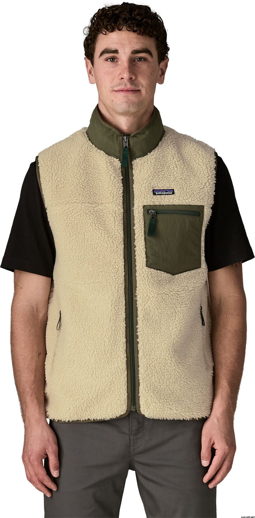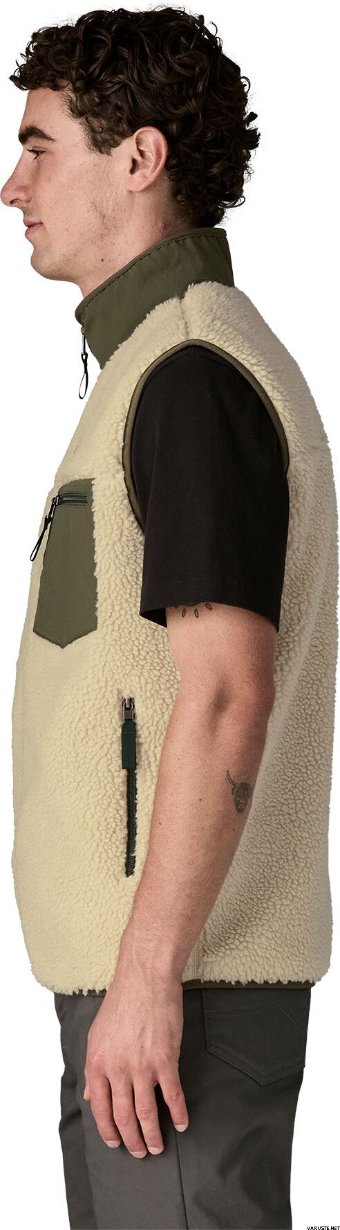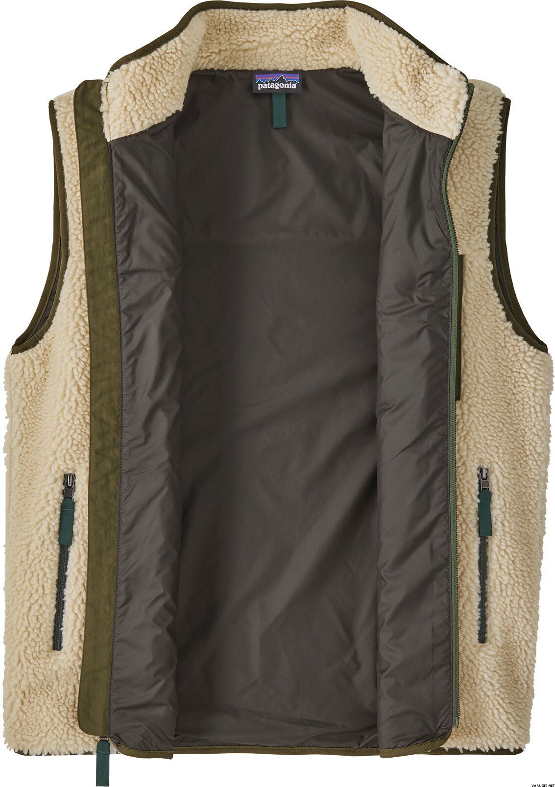 - 縦ジッパー式チェストポケット。起毛ポリエステルメッシュで裏打ちされたジッパー式ハンドウォーマーポケット