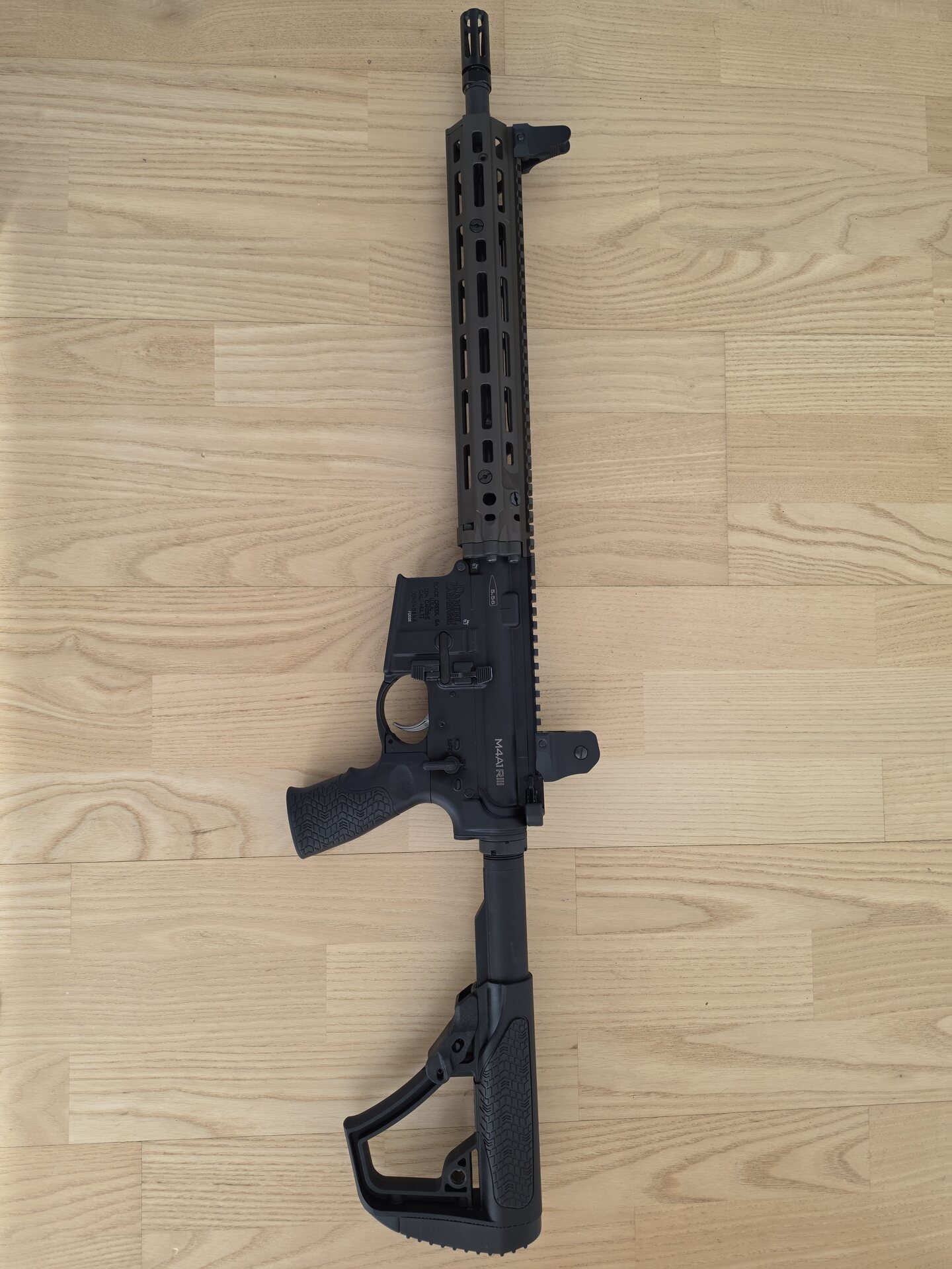 M4A1 RIII AR15 スタイルの銃器は、完全に両手利き用の下部を備えており、左利きと右利きの両方の射手が、利き手をライフルのグリップから動かしたり離したりすることなく、ボルトキャッチ、セーフティセレクター、およびマガジンリリースを操作できます。GRIP-N-RIP チャージングハンドルも両手利きです。M4A1 オリジナルで使用されていた RIS II ピカティニークアッドレールを採用し、M-LOK アタッチメントを備えた 12.5 インチ RIS III レールに交換して軽量化を図りながら、M203 グレネードランチャーアタッチメントも提供しています。オリジナルと同様に、M4A1 RIII は、恒久的に取り付けられた Daniel Defense フラッシュサプレッサーを備えた 14.5 インチのコールドハンマー鍛造 M4 プロファイルバレルを中心に構築されています。このライフルには、人間工学に基づいた Daniel Defense バットストックとピストルグリップも付属しています。