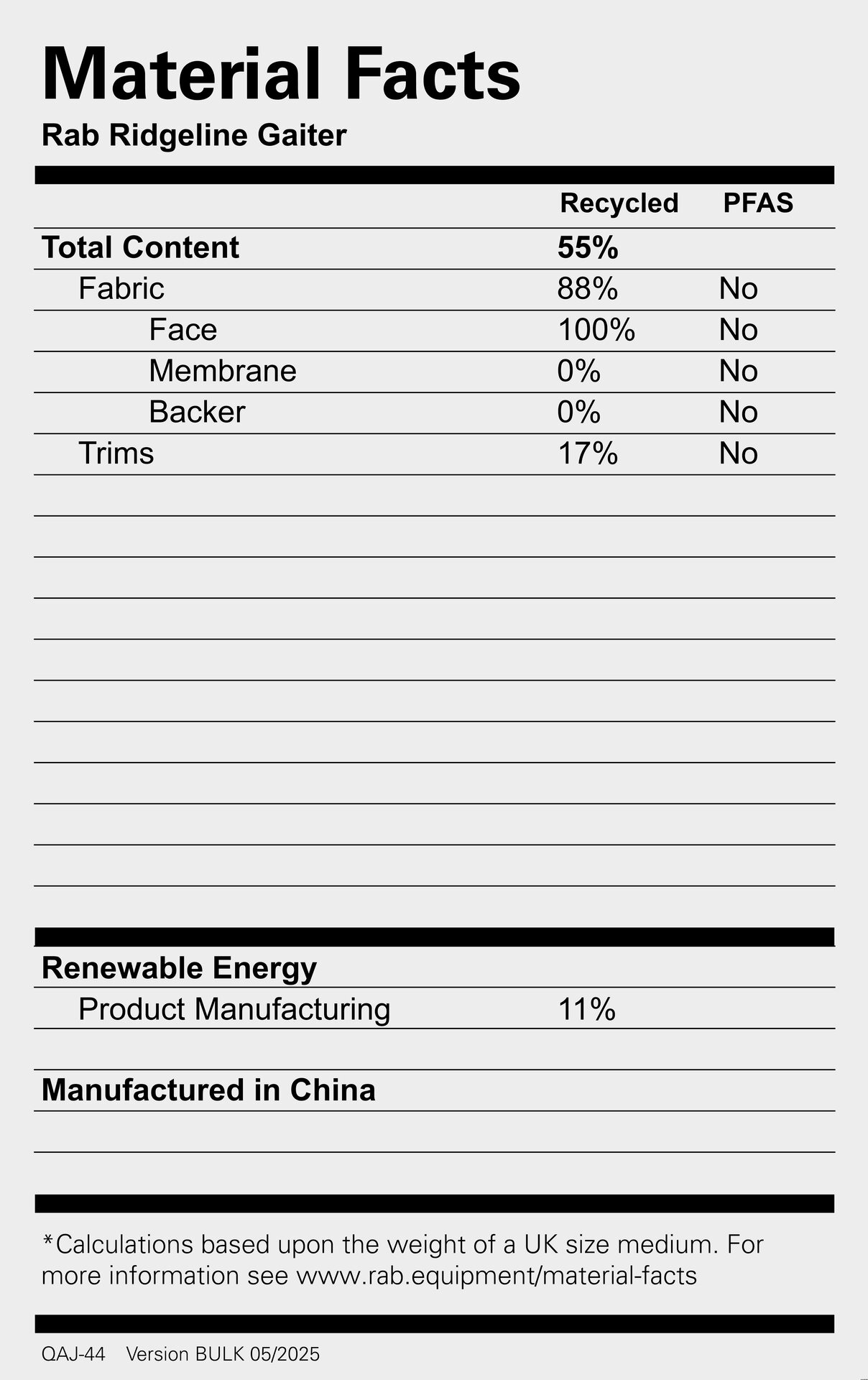 リッジラインゲイターは、トレイルの砂利や水しぶきを防ぎながら、ペースを落とさないよう設計された、超軽量で薄型のゲイターです。脚にぴったりとフィットし、トレイルシューズやローカットのハイキングブーツと組み合わせることで、高速ハイキング、ランニング、長距離トレッキングに最適です。防風性と通気性に優れた生地は、露出した尾根からの冷気を遮断しながら、体温の上昇を抑えます。補強されたキッカーパッチが、必要な部分の耐久性を高めつつ、全体の厚みを最小限に抑えています。