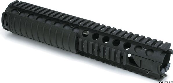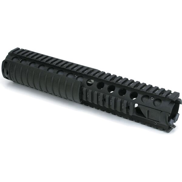 KAC M5 RAS(レールアダプターシステム)は、米軍のM16A4用に開発され、これまでに数十万本のレールが配備され、AR-15プラットフォーム向けに最も実戦で実績のある設計の一つです。この非フリーフロートハンドガードは、全長にわたって純正ミルスペックM1913ピカティニーレールを備えた、取り付けが簡単なドロップインアップグレードです。M5 RASが他の2ピースクアッドレールと異なる点は、クランプとネジの組み合わせでライフルのバレルナットにしっかりと固定され、タクティカルアクセサリーを取り付けるための非常に堅牢な基盤となっていることです。KAC 11リブレールパネル3枚付属。
