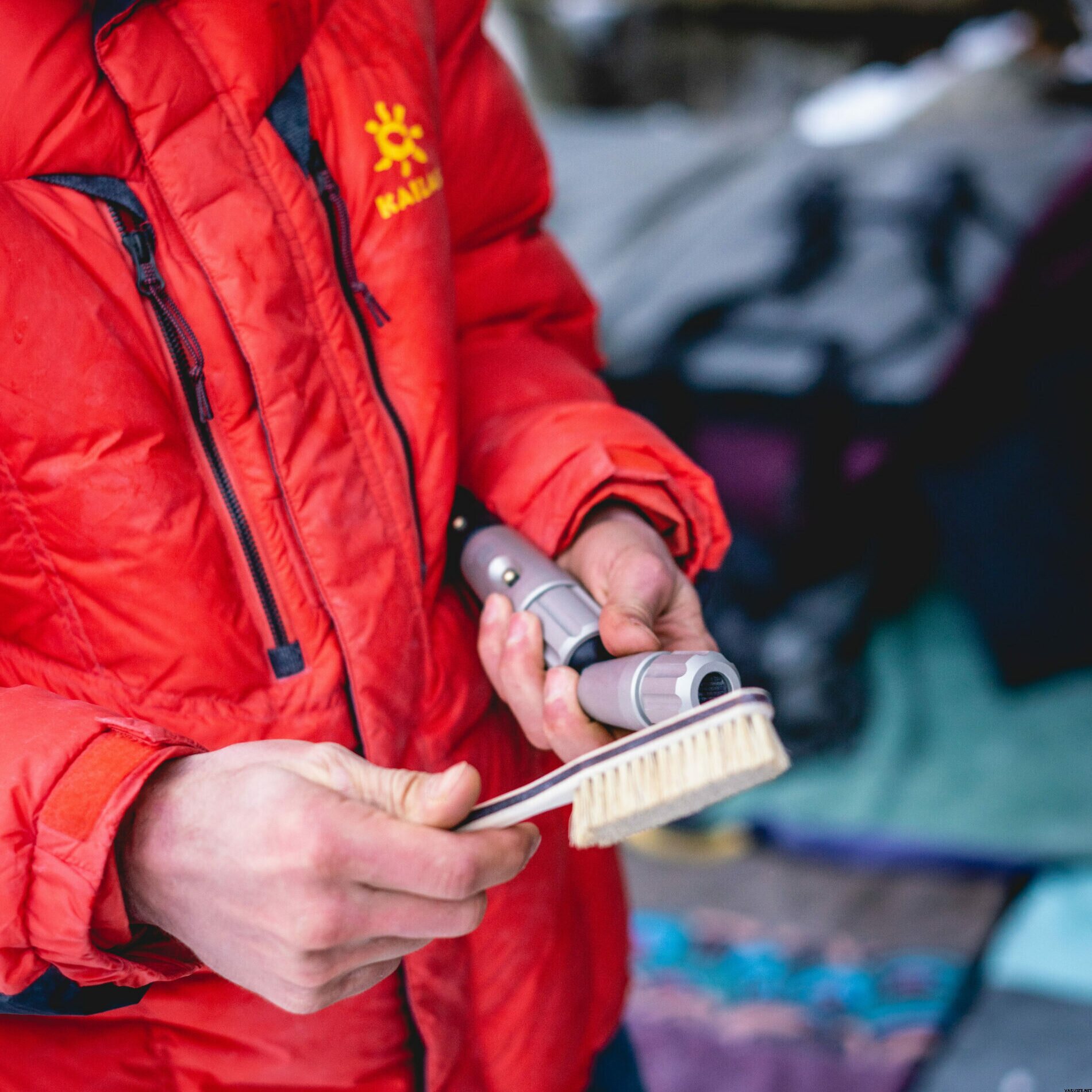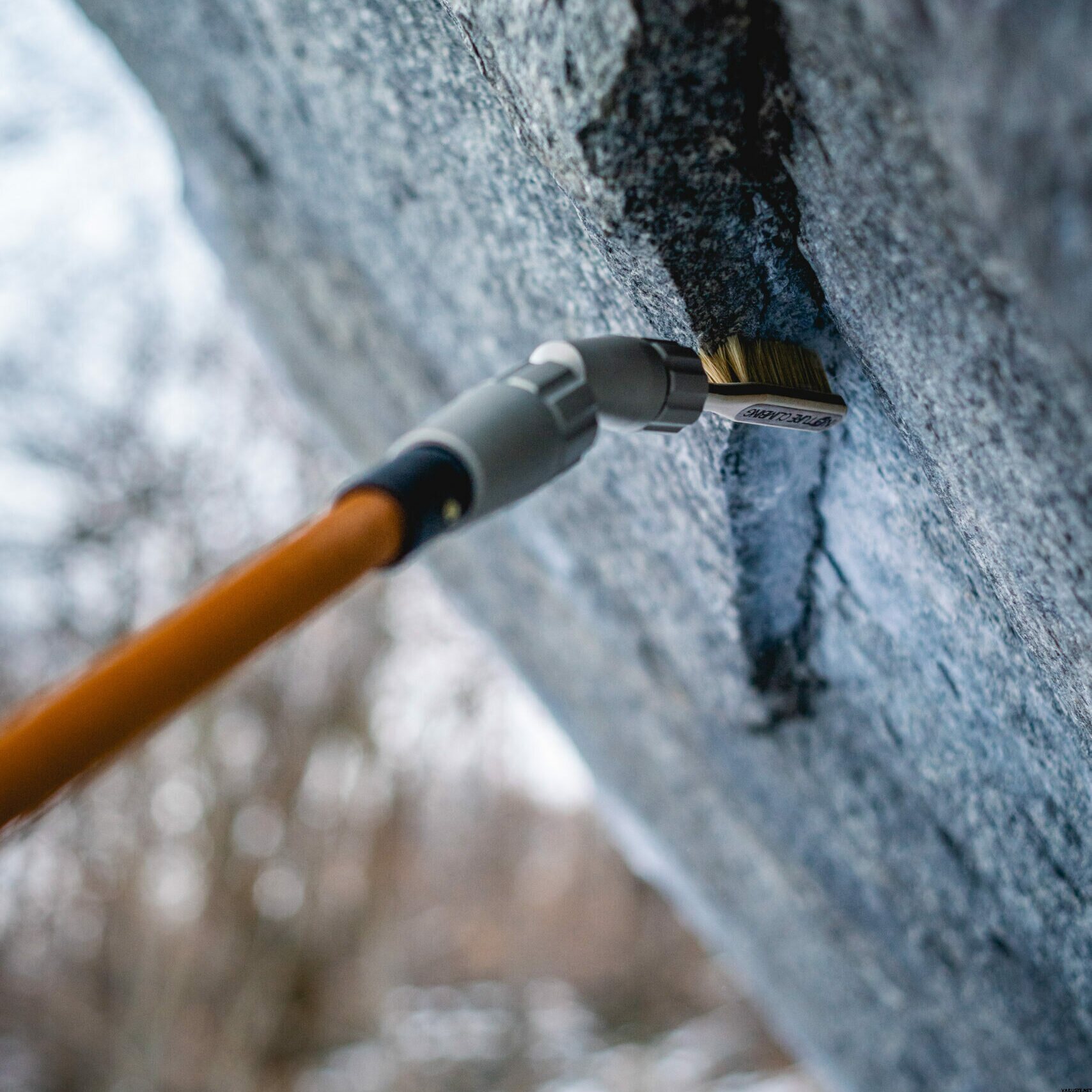 - De aluminium borstelkop doet tevens dienst als handkoeler tijdens het boulderen in de buitenlucht.